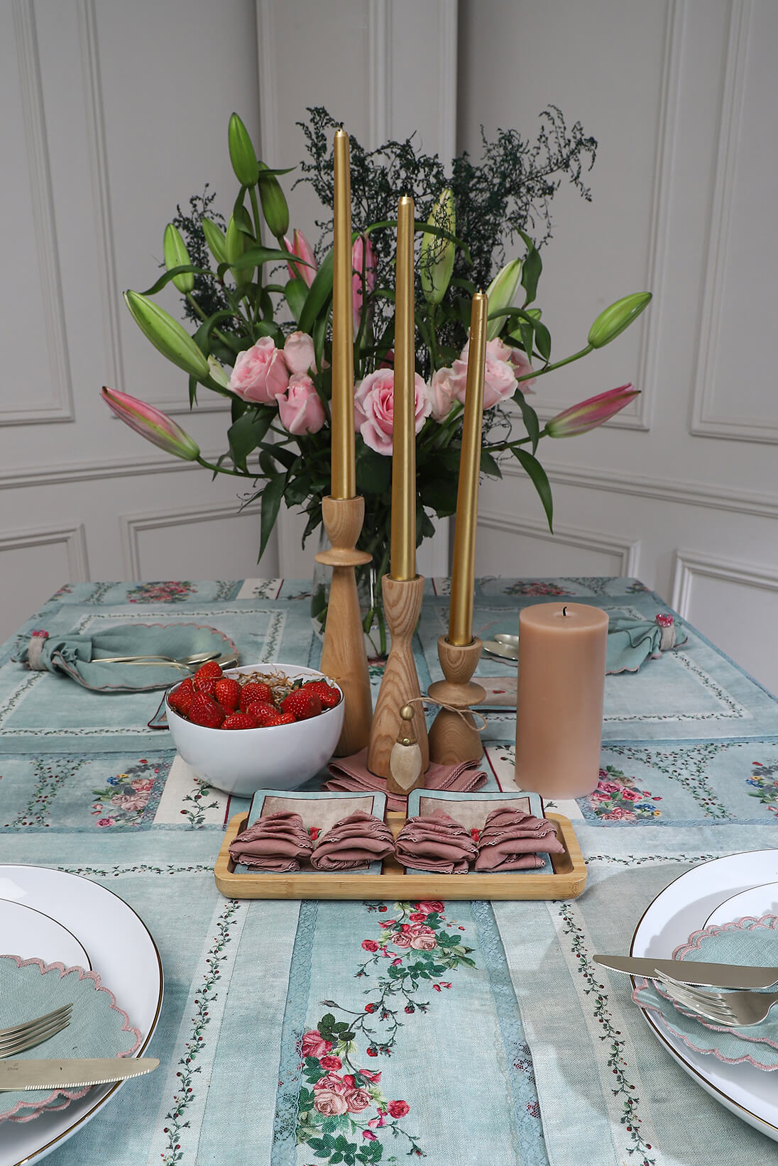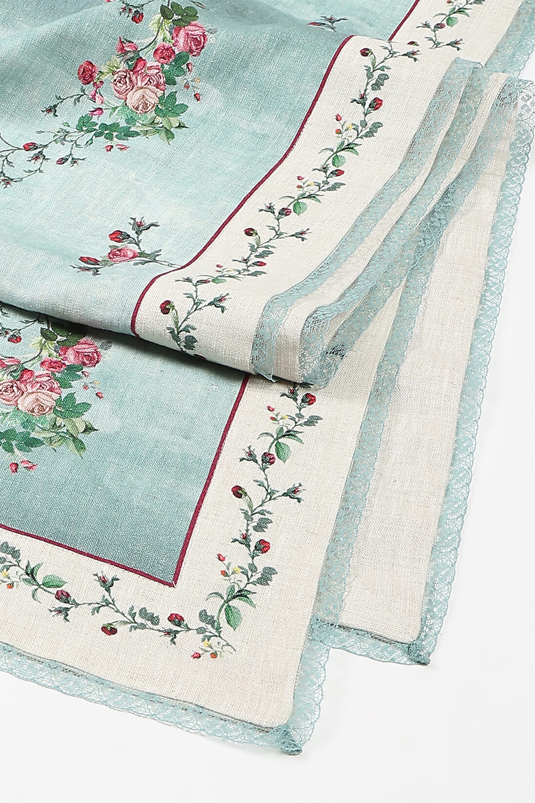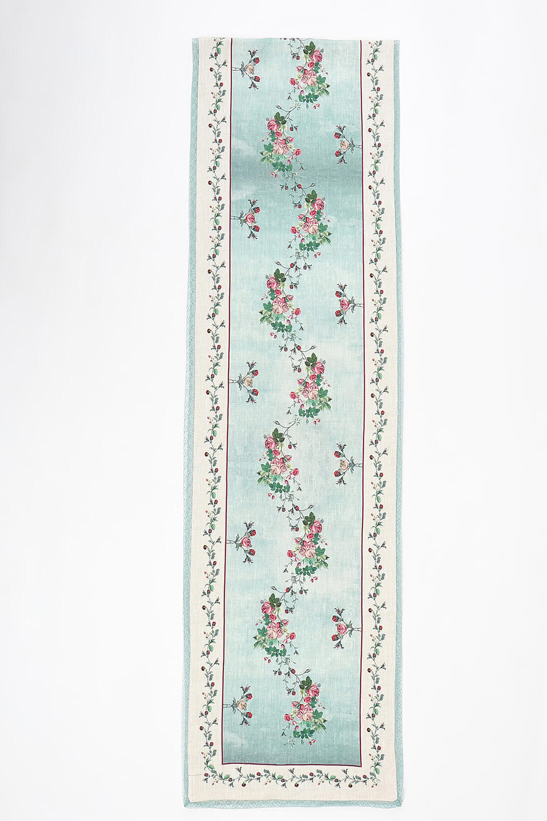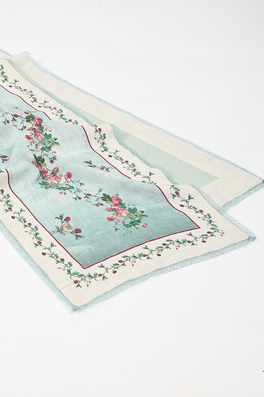 Jahanara runner features an ottoman inspired watercolor pattern on a coarse linen surface is finished with fine french lace edging.