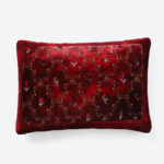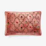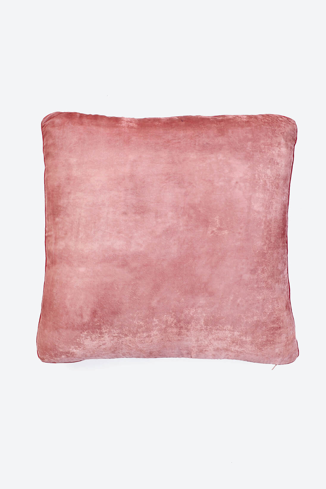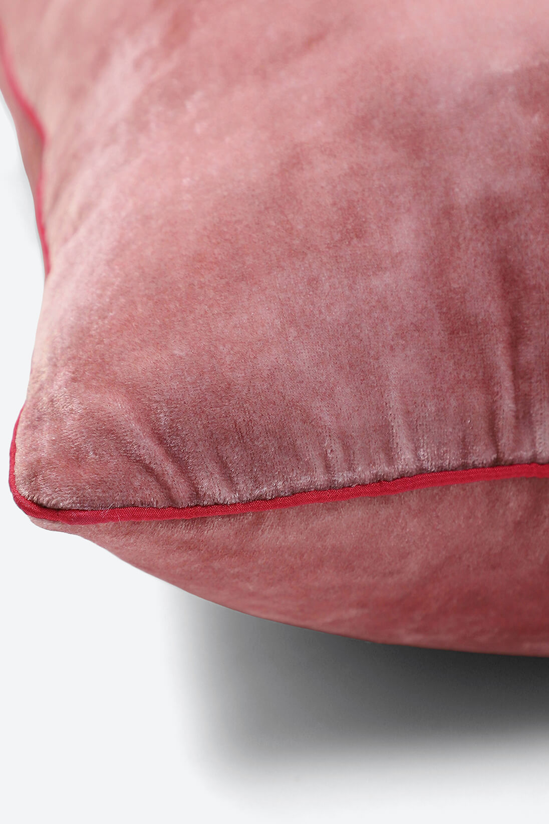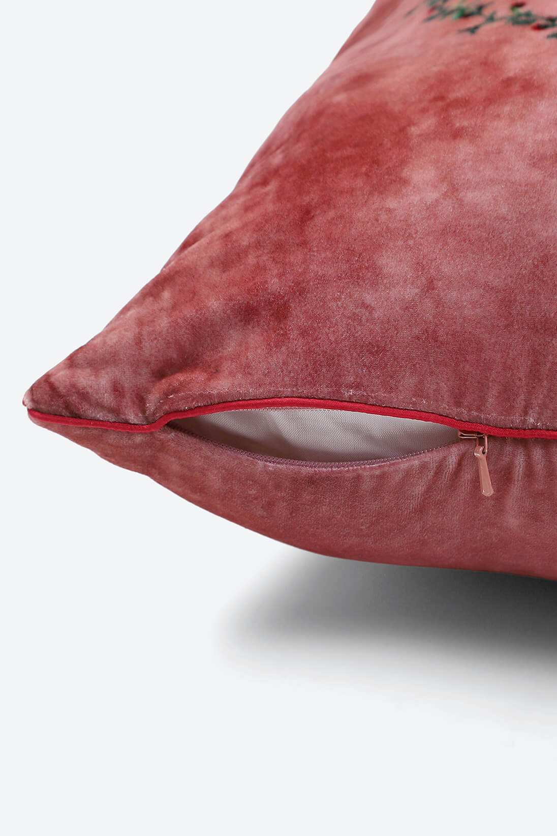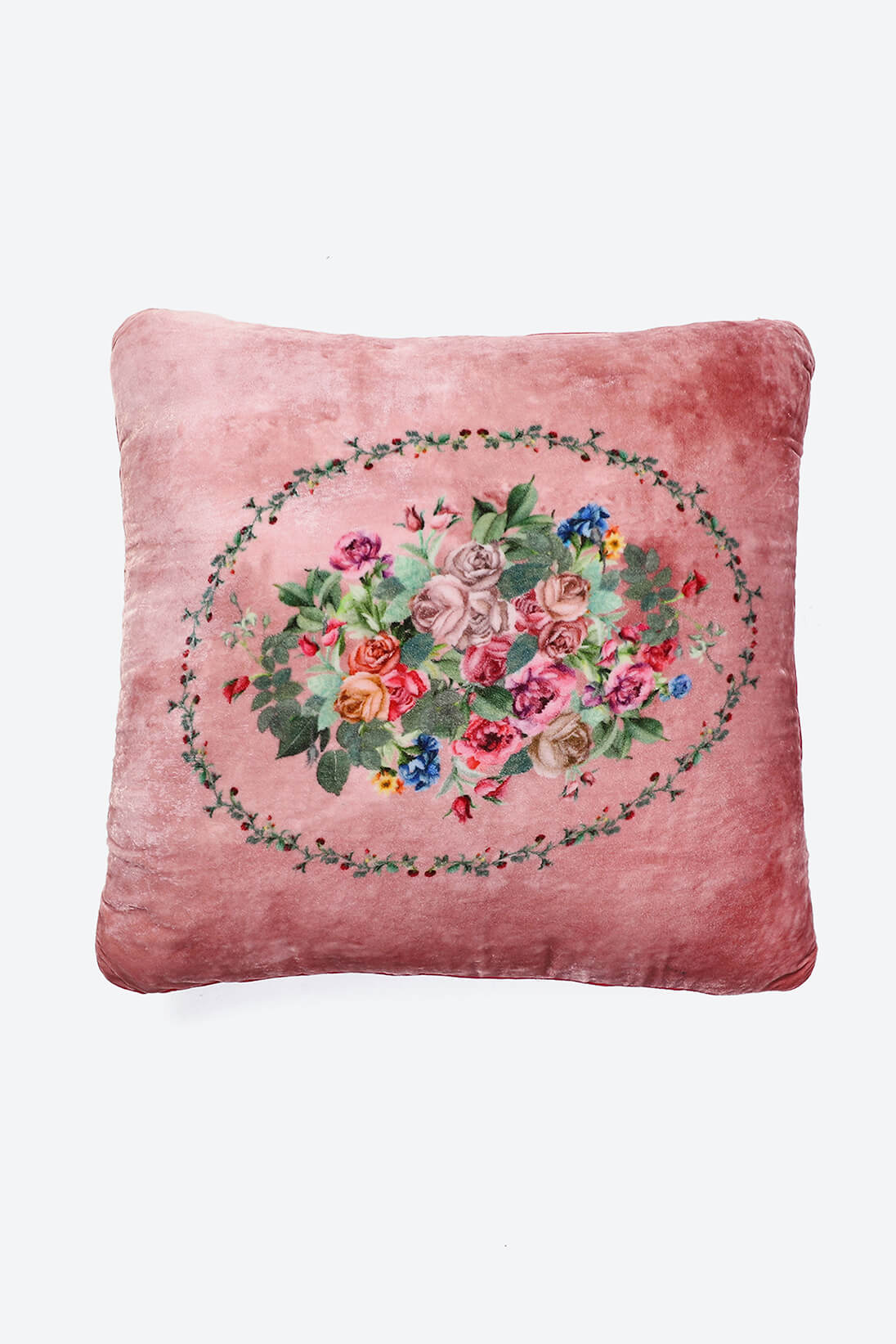 A soft silk velvet cushion in a warm shade of blush, featuring a hand-painted floral motif inspired by baroque details. A elegant accent for festive homes.
