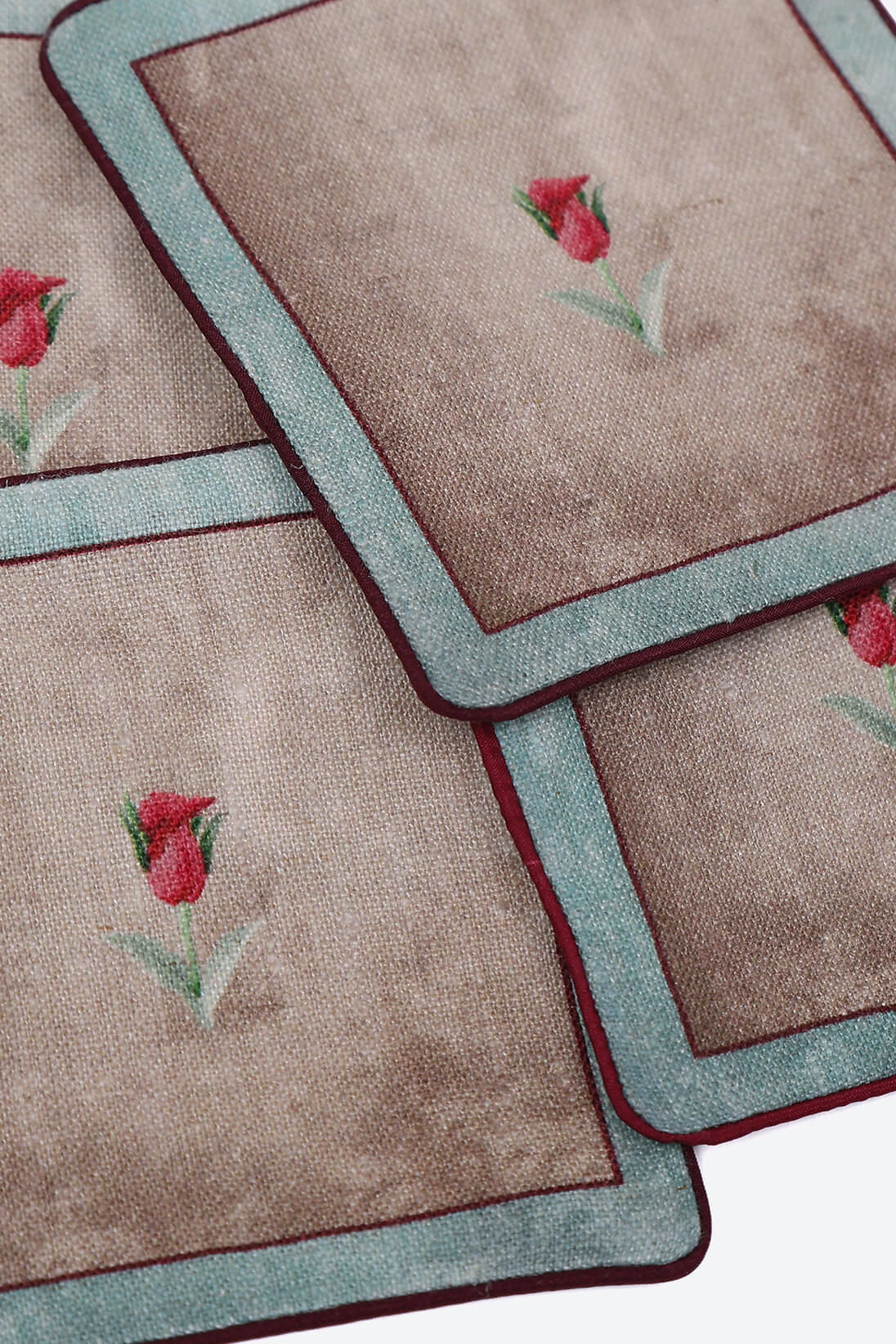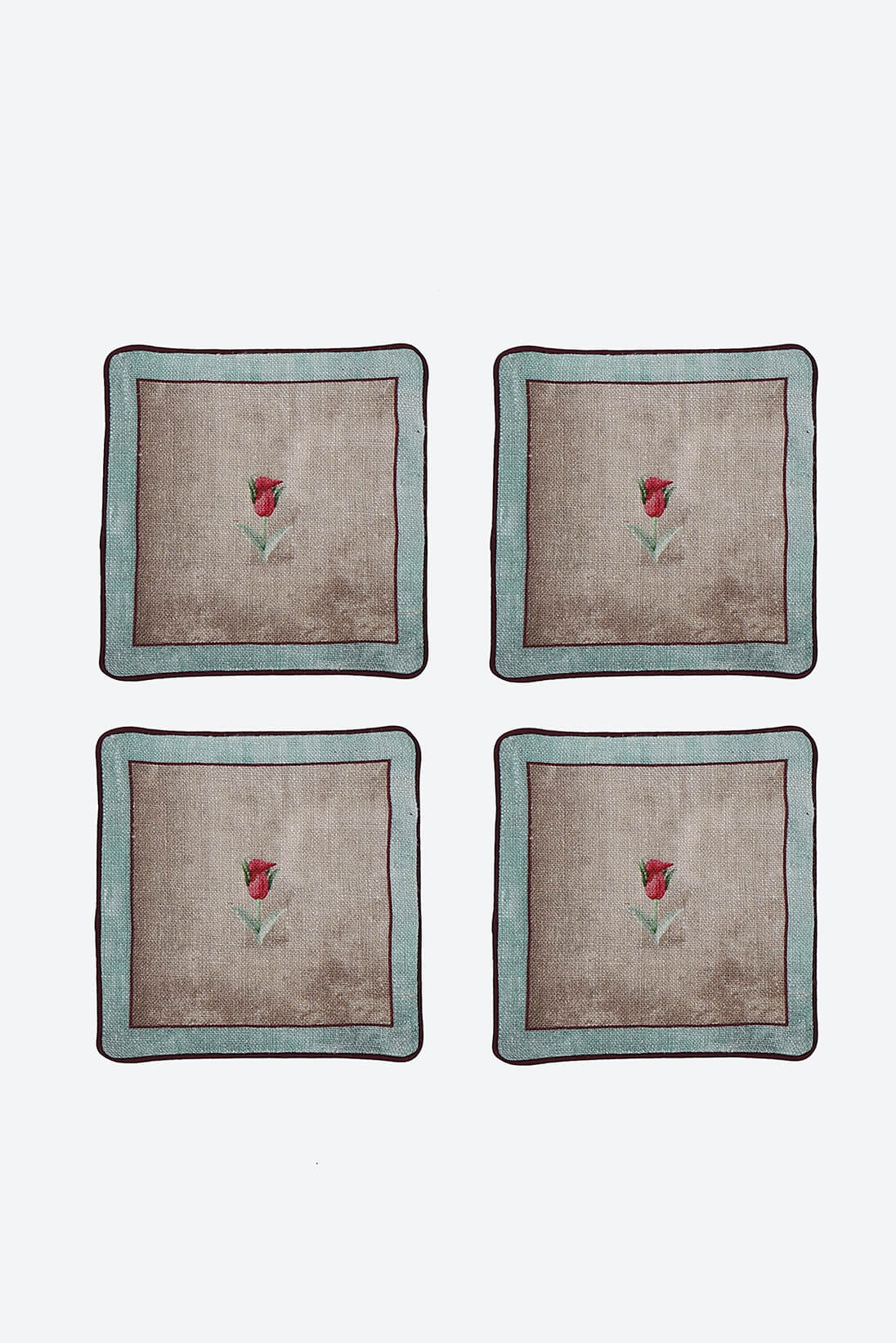 Nargis Coaster features an ottoman inspired watercolor framed floral motif on a coarse linen surface is finished with silk pining.