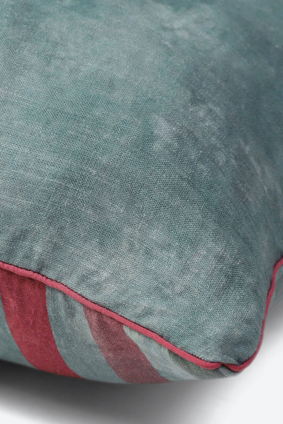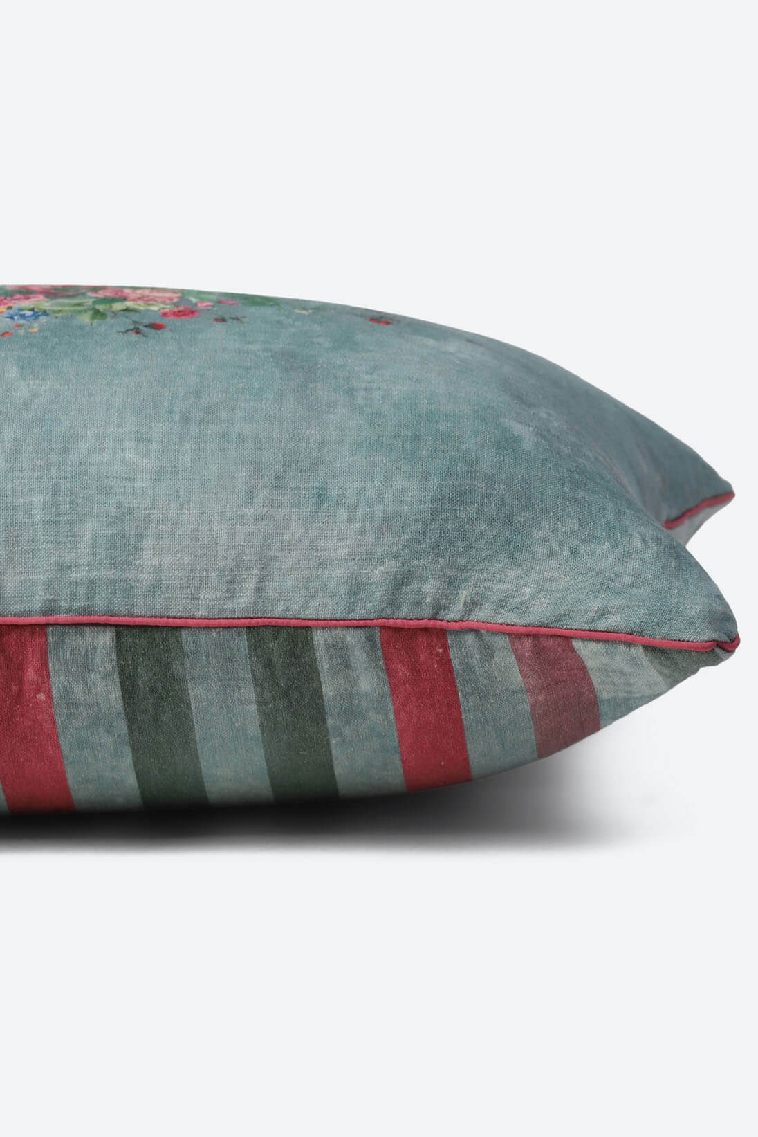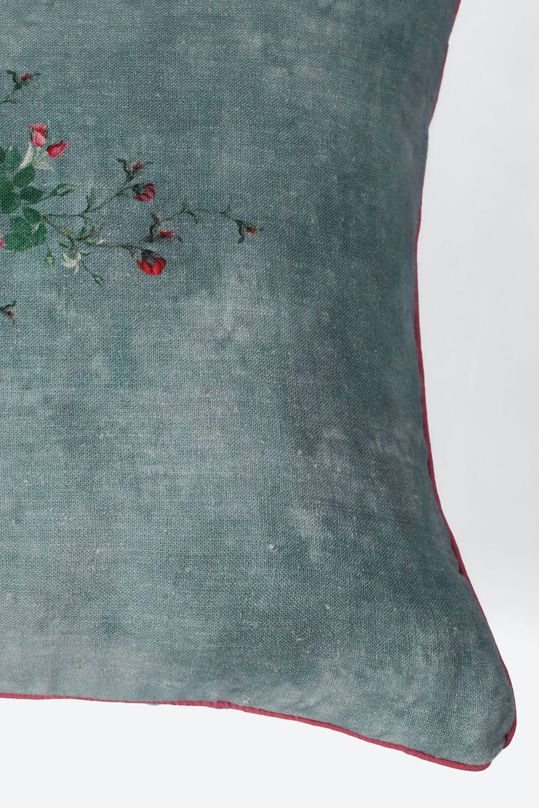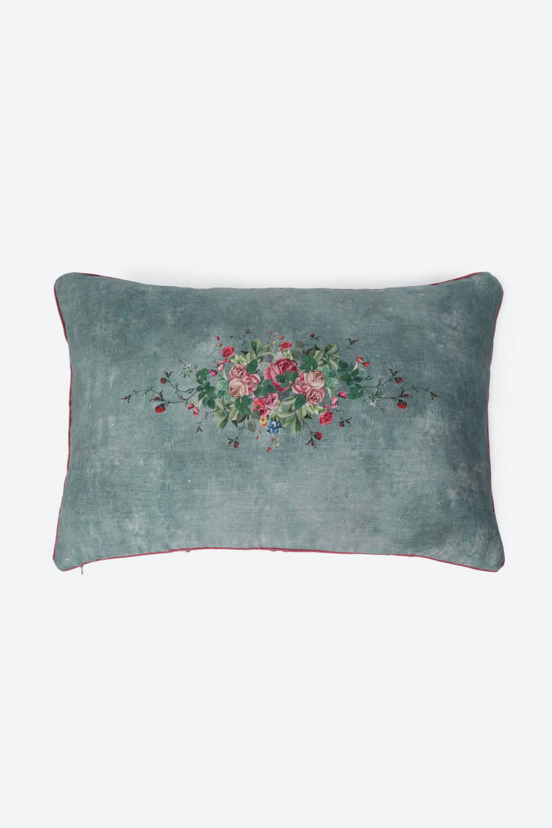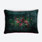 A soft silk velvet cushion in a deep shade of turqouise, featuring a hand-painted floral motif inspired by baroque details. A elegant accent for festive homes.