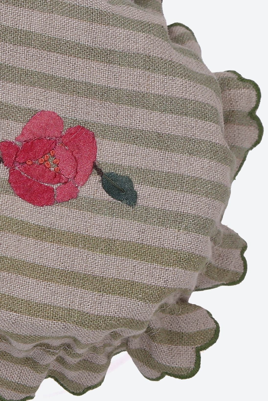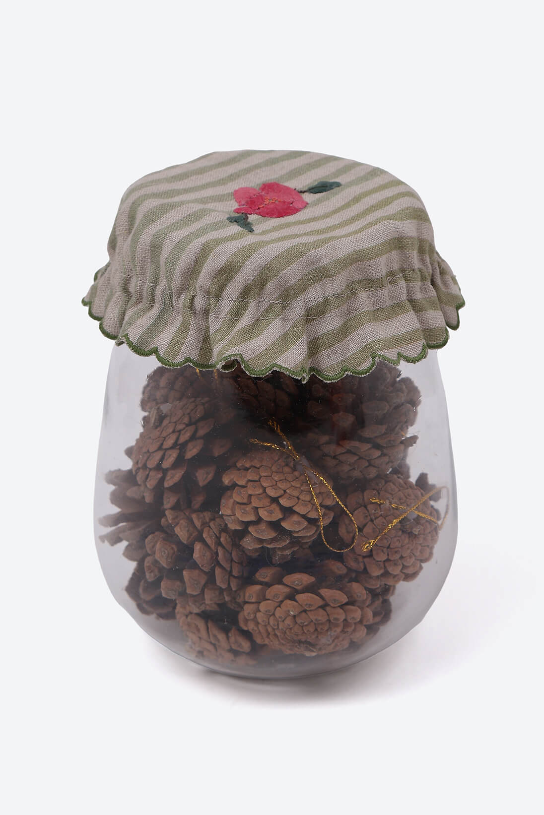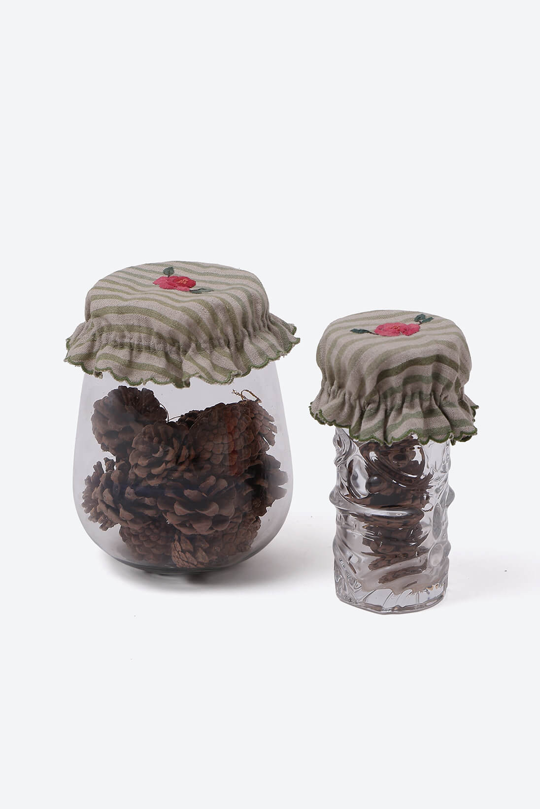 Cozy jarcovers with hand appliqued floral detail on striped linen base.
