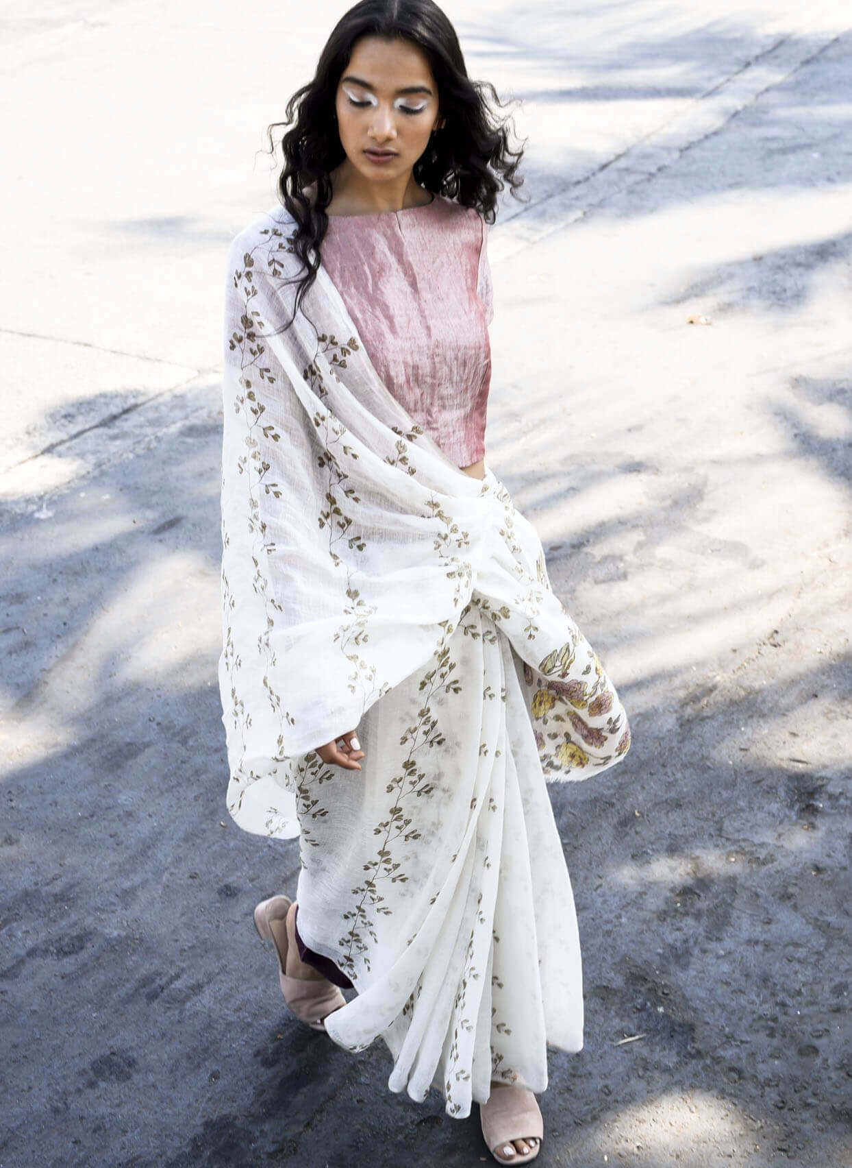 Hand block printed linen ivory sari.