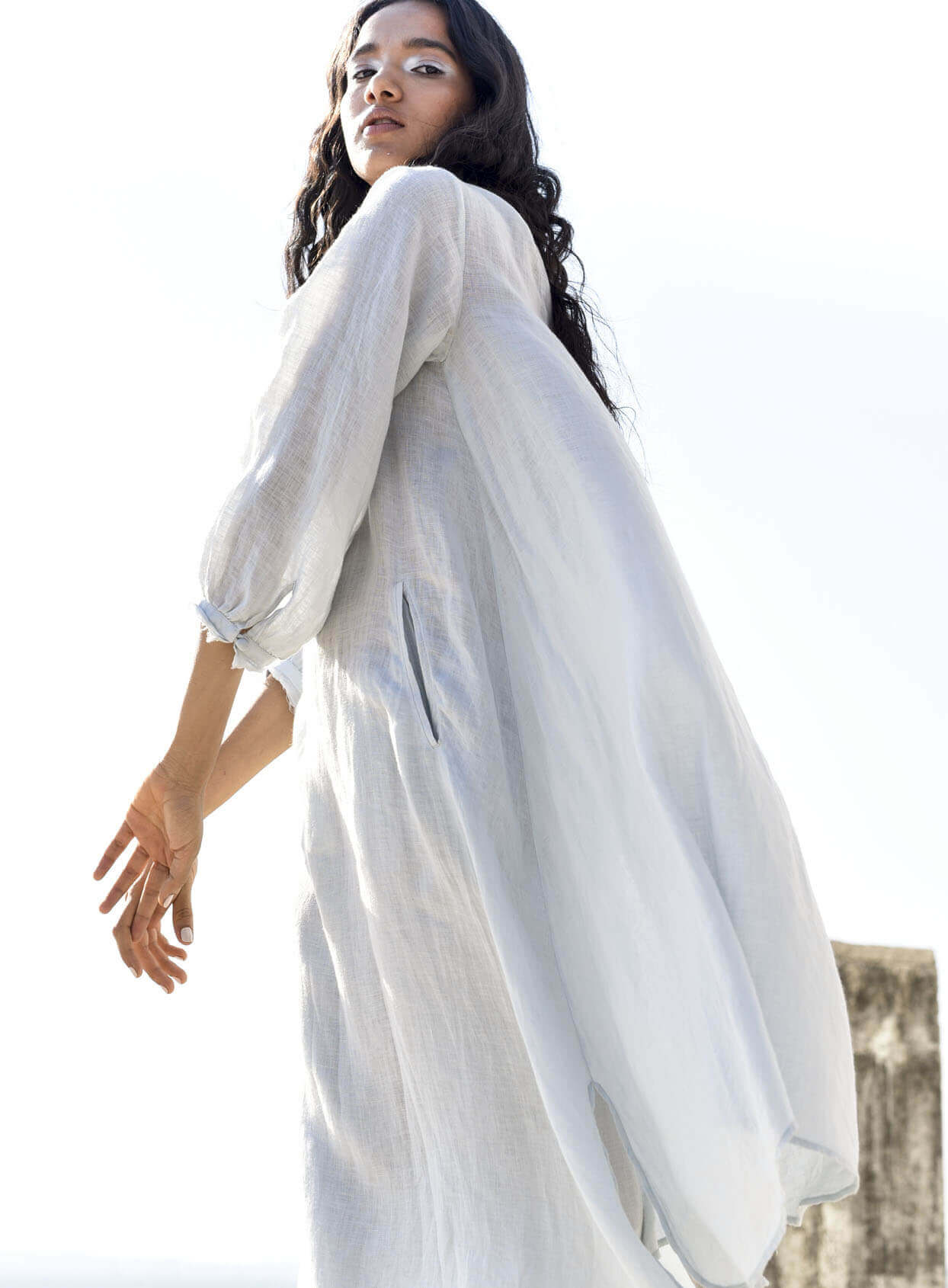 Ice blue raw edge linen tunic