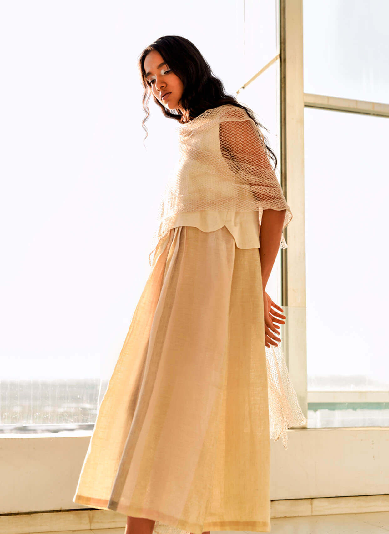 Linen kalacotton tunic with linen fishnet stole
