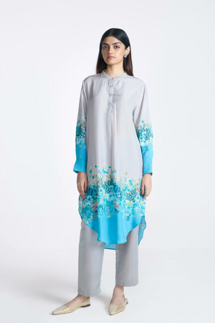 Ash Grey Shadow Print Silk Kameez Set