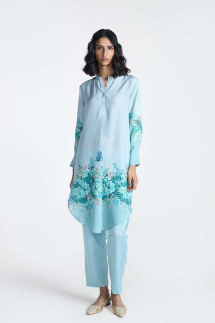 Turquoise Shadow Print Silk Kameez Set