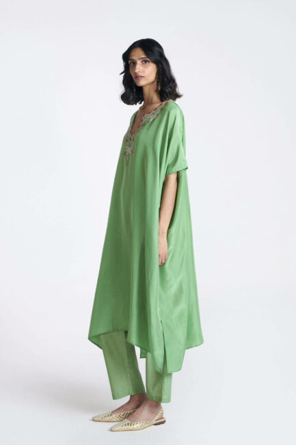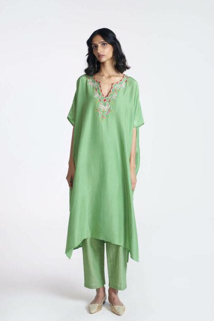 Green Embroidered Silk Kaftan Set