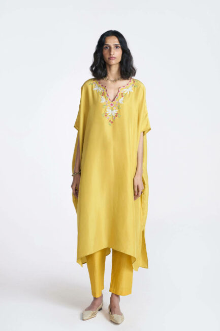 Yellow Embroidered Silk Kaftan Set