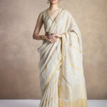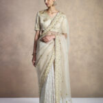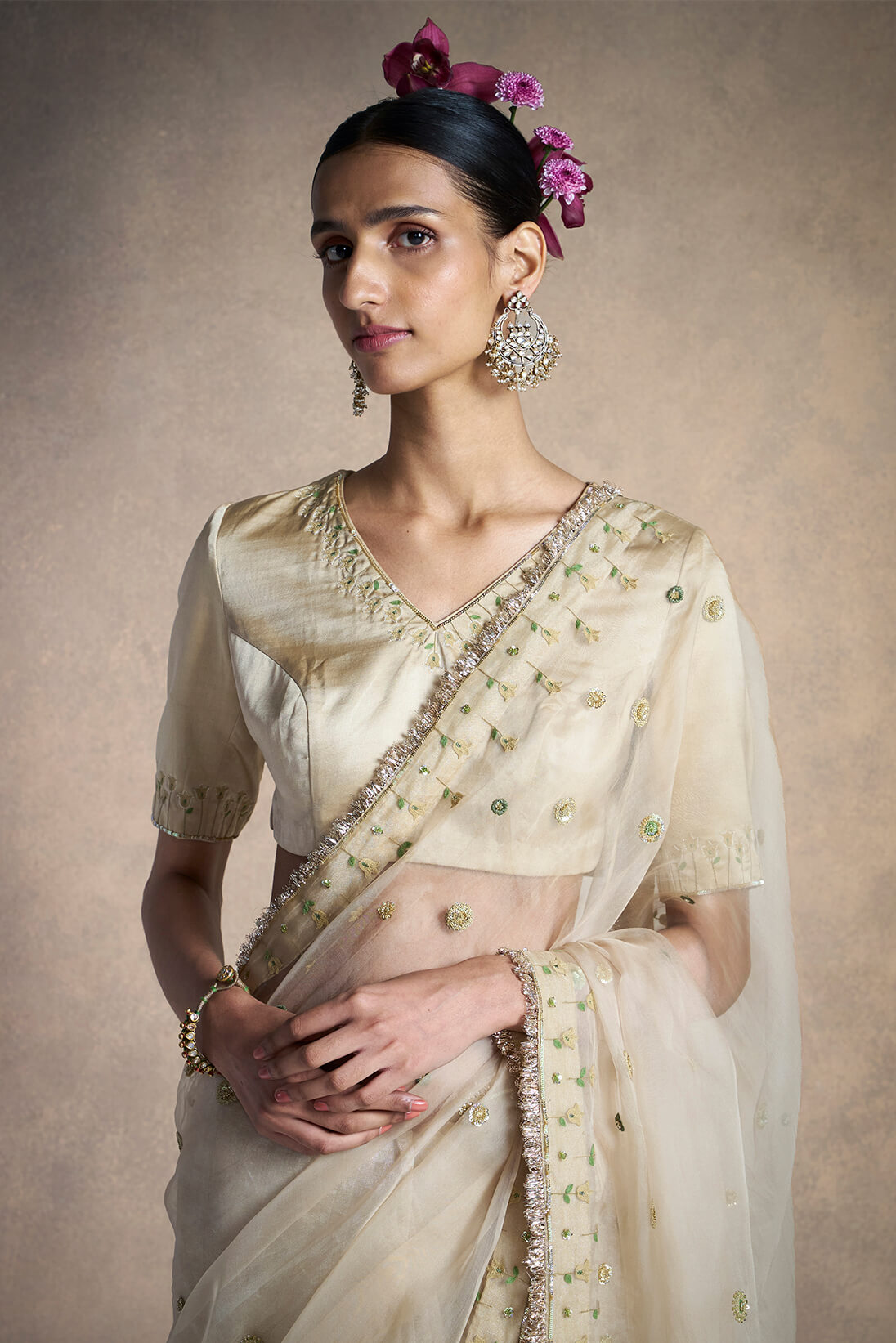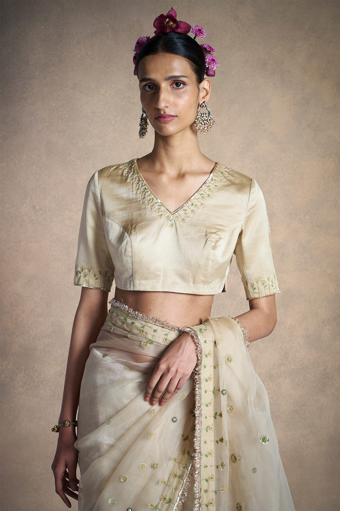This beige satin blouse comes with delicate floral embroidery and sequin embellishment on the neckline and sleeves.