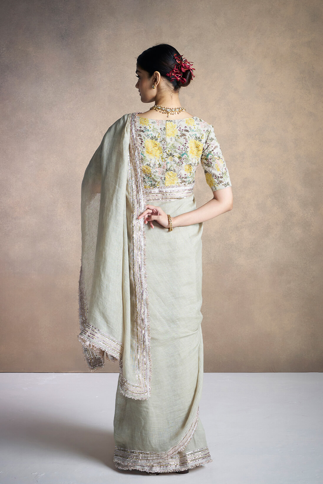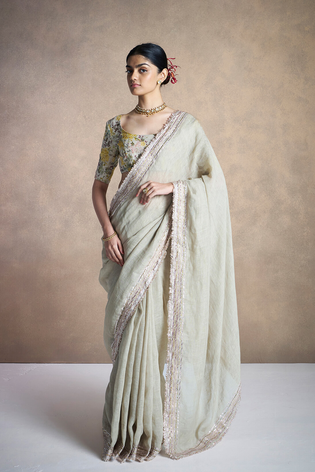 The linen sari is adorned with the sheen of gota kinaari on the border making it both subtle and elegant. The blouse shown in the picture is not included with the sari.The sari is 5.5 meters in length.