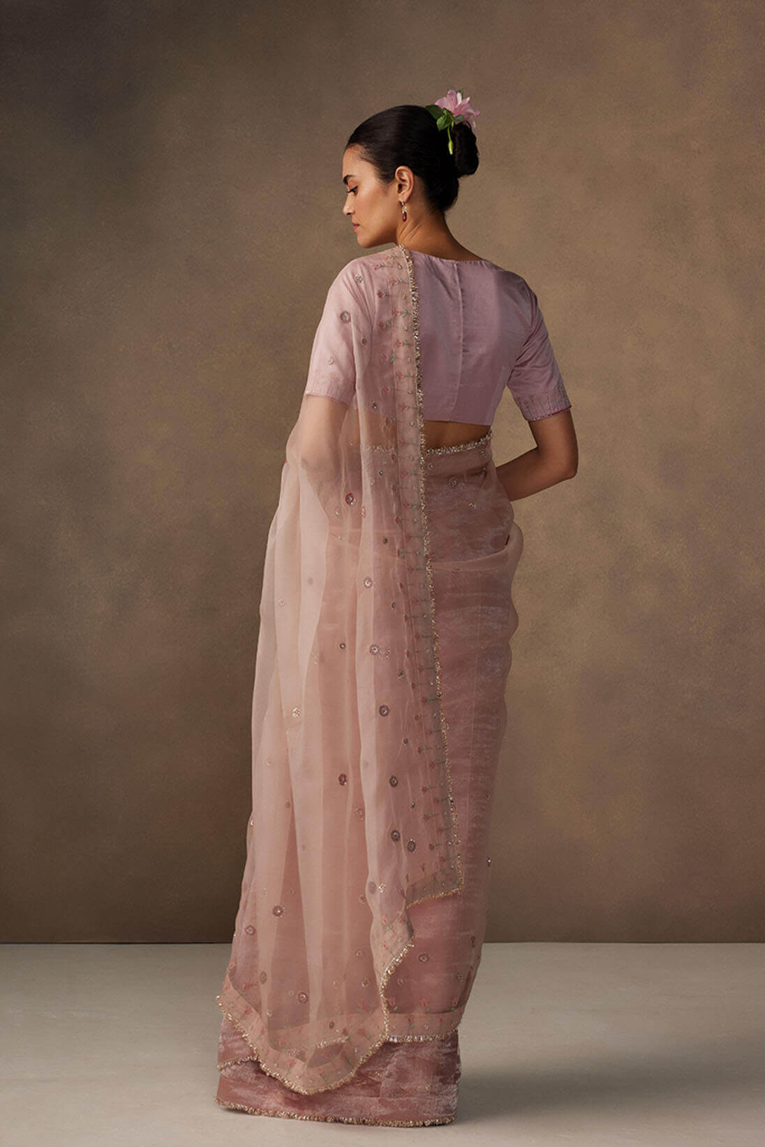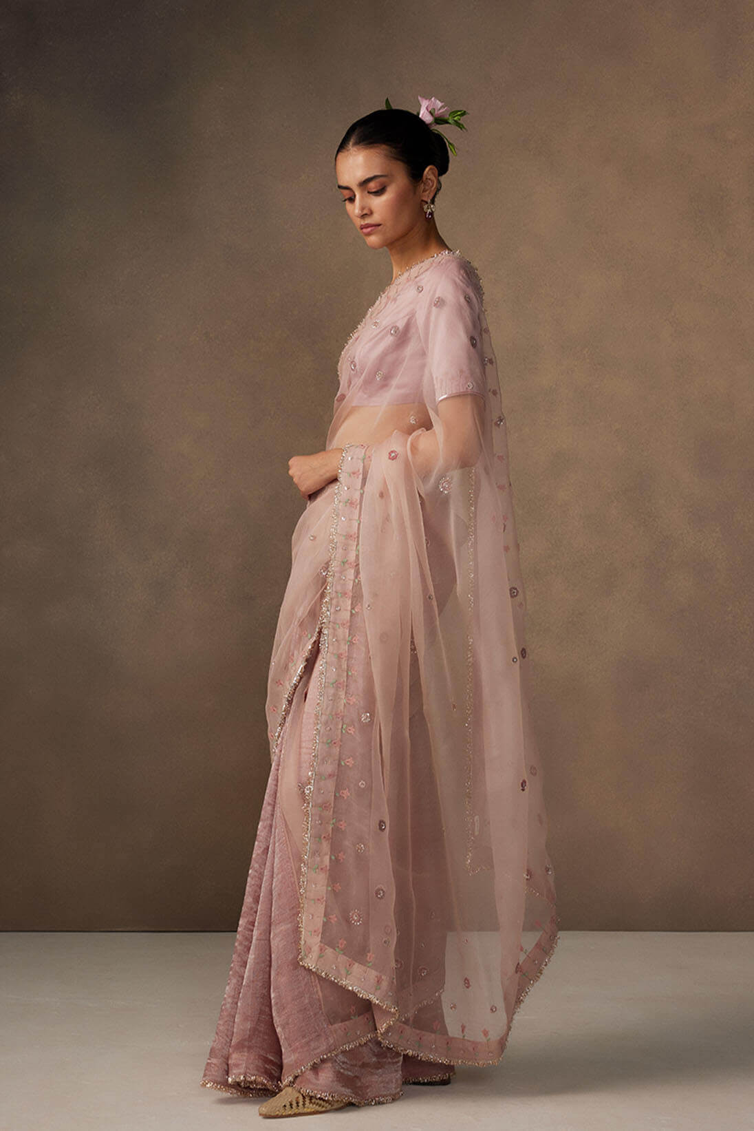 The Blush buti sari is adorned with delicate floral butis hand-embroidered along with a subtle shimmer of zari and sequins. A beautiful play of linen zari along with organza in the pallu and gota kinaari on the edging makes this sari perfect for your festivities. The blouse shown in the picture is not included with the sari. The sari is 5.5 meters in length.”