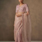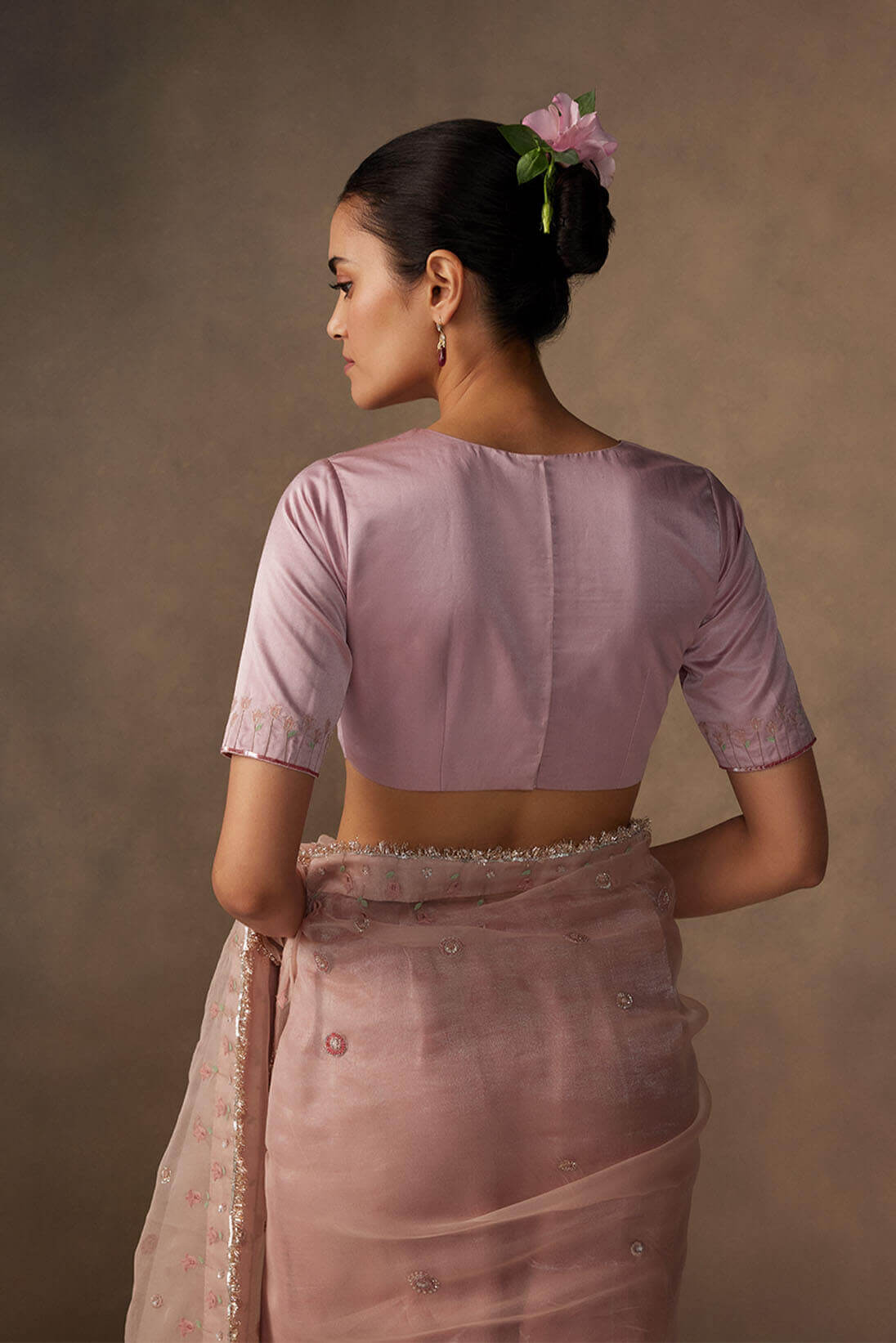 The blush satin blouse comes with delicate floral embroidery and sequin embellishment on the neckline and sleeves.