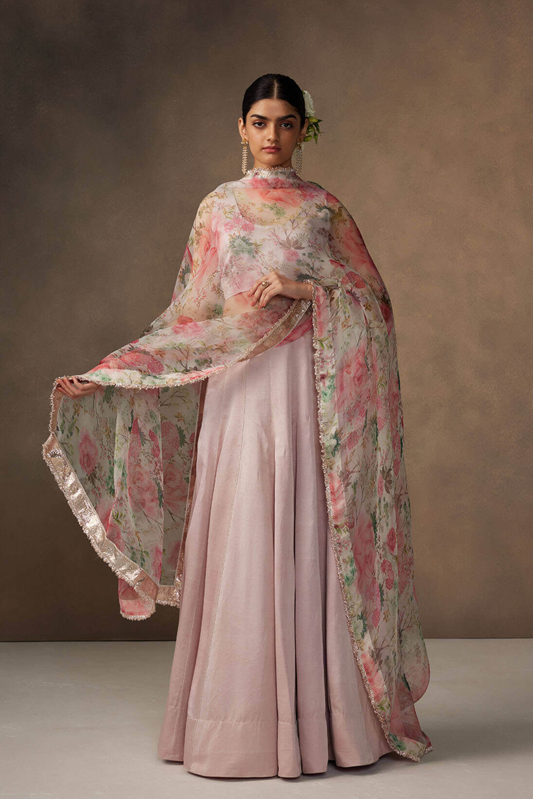 The beauty and sheen of handwoven satin come alive in this solid blush lehenga,