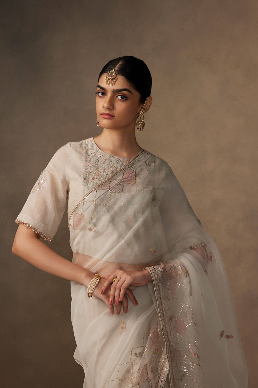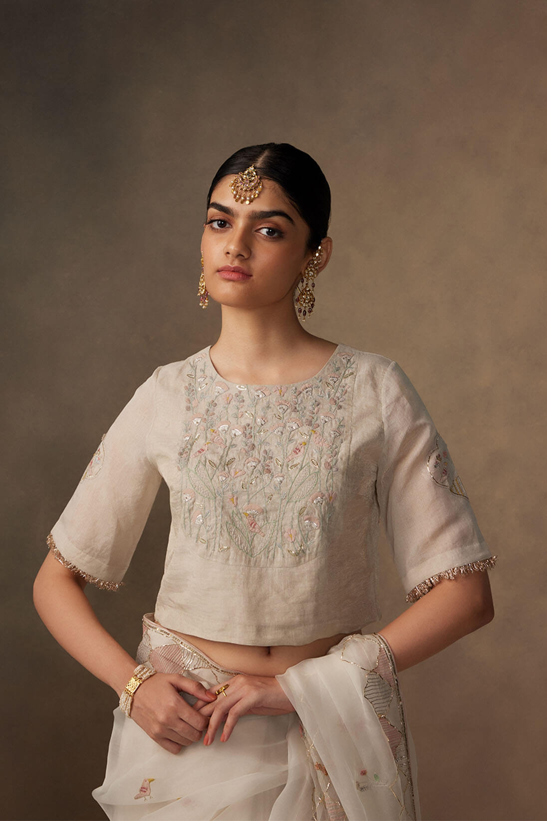 The Ivory zari blouse is decorated with beautiful hand applique of florals and birds with embroidered details using dabka that reminds us of the subtle frescoes of Bundi.