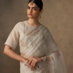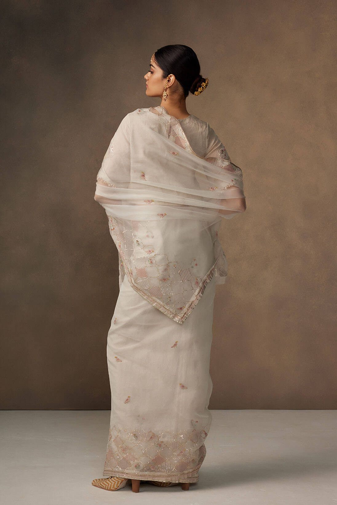 Little birds sitting in a Rajasthani Mehrab Jaali pattern,embroidered using techniques like hand-embroidered applique, gota, dabka on a Zari Linen sari with Organza Pallu.The blouse shown int he picture is not included with the sari. The sari is 5.5 meters in length.