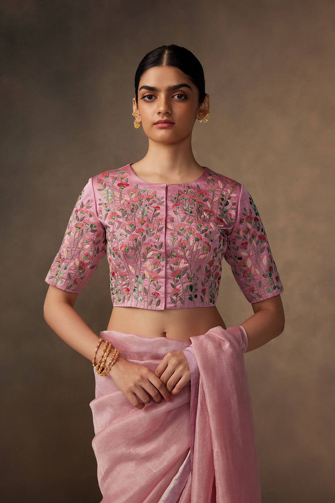 The florals in hand applique technique come alive with subtle embroidered details in the pink applique blouse.
