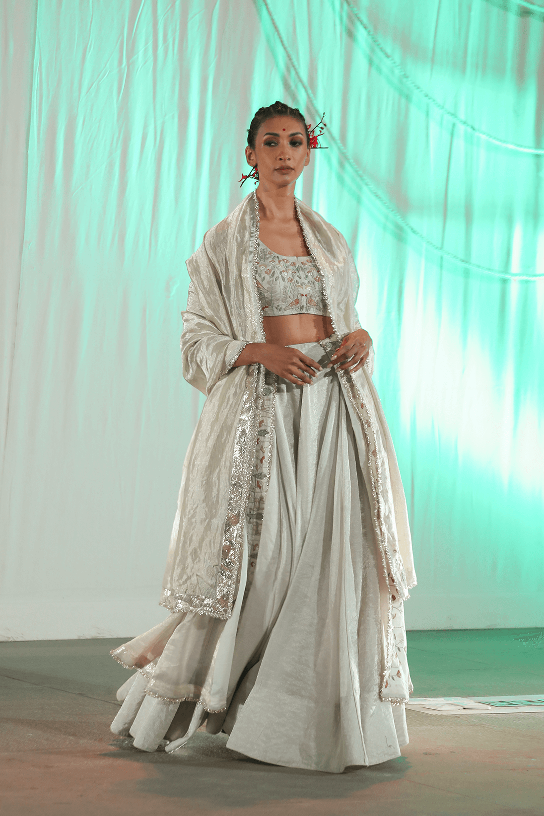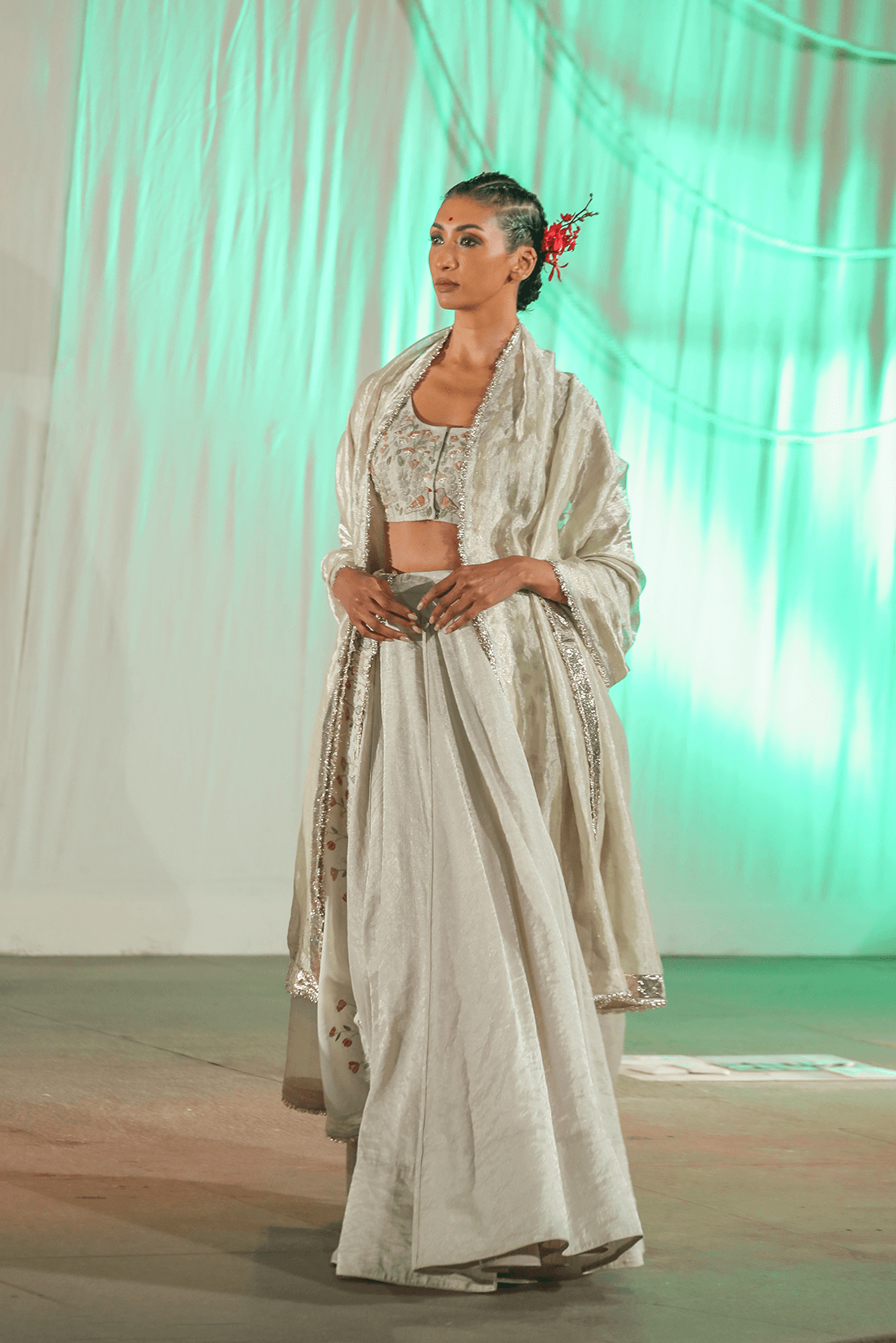 Our solid Silver Zari Lehenga, embellished with hand applique and embroidered with details in monotones of silver on the blouse is a statement to light up your special ocassions.This lehenga set comes with the blouse.The dupatta shown in the image is not included in the lehenga set.