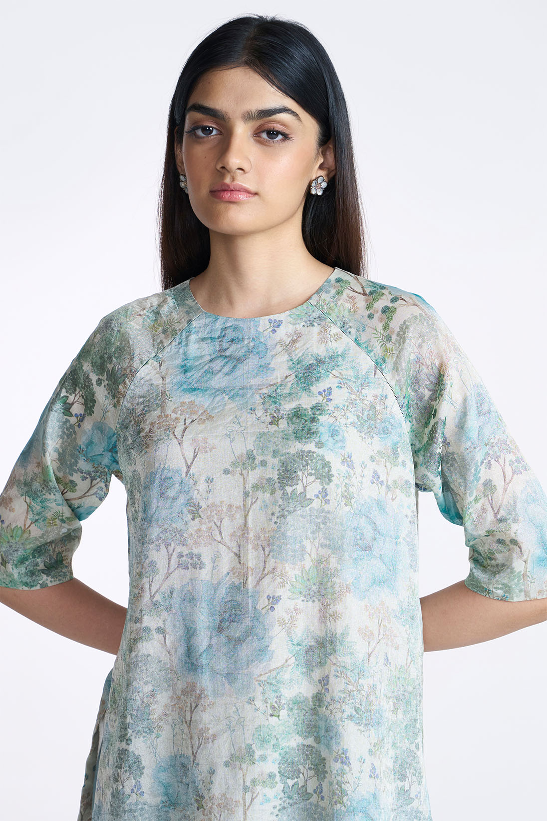 Our zari fabric gives a vintage feel to the floral prints taking you back to a bygone era . Paired with cotton silk trousers, it is a perfect choice
