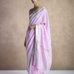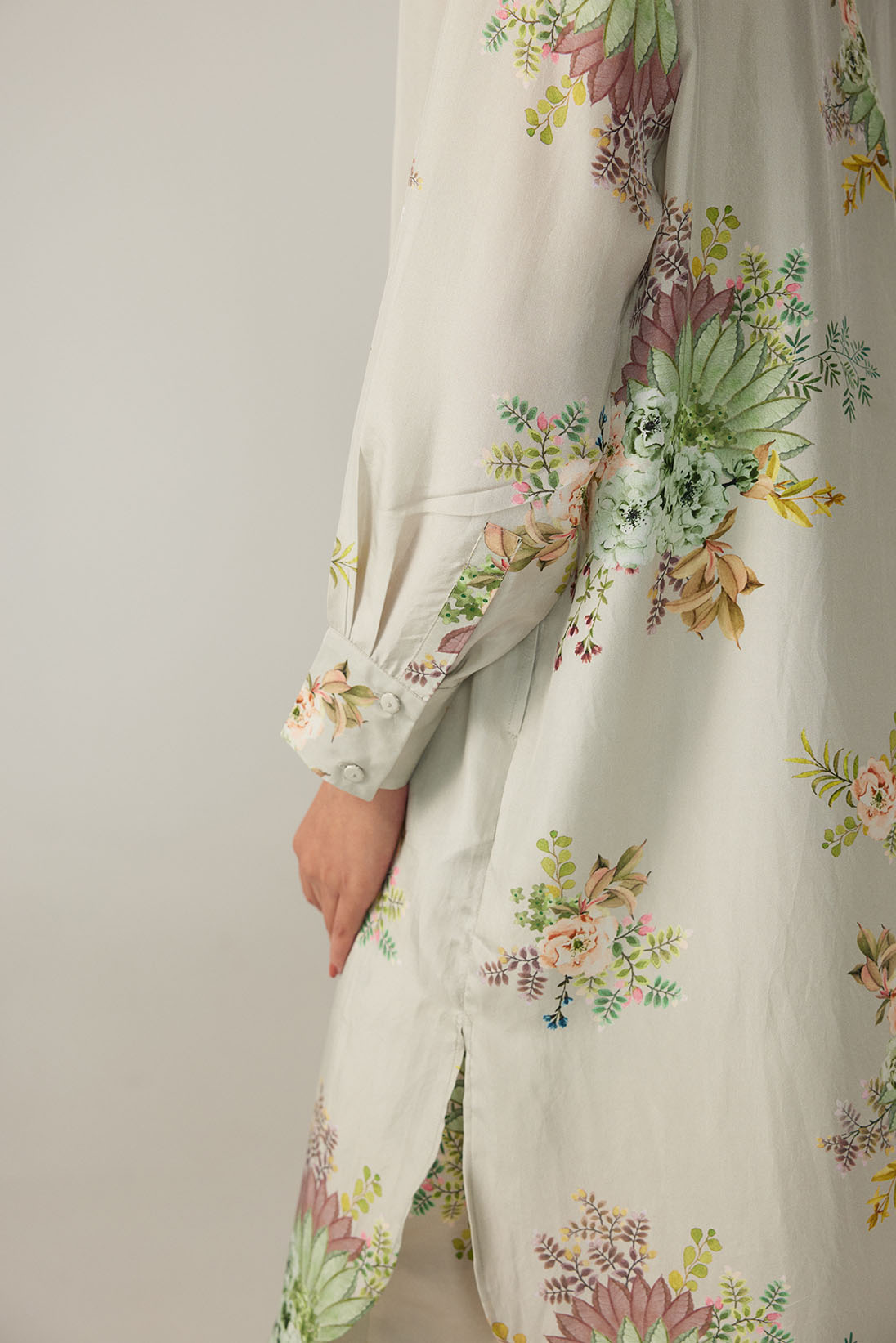 of lush flora scattered in soft silk kameez paired with printed trousers in satin silk.