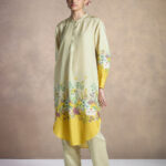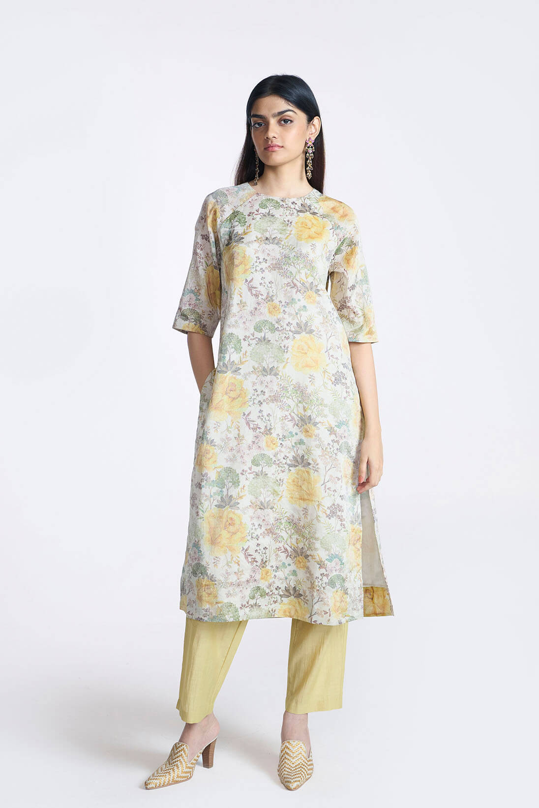 Our zari fabric gives a vintage feel to the floral prints taking you back to a bygone era . Paired with cotton silk trousers, it is a perfect choice