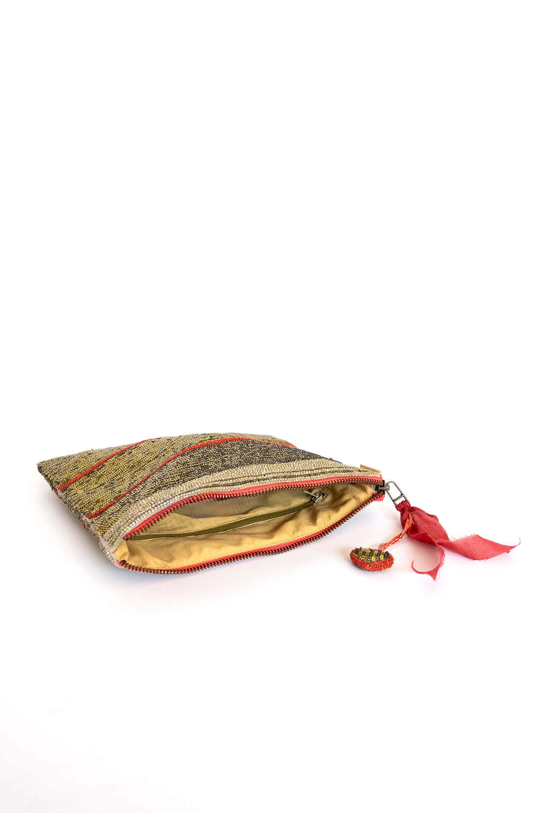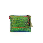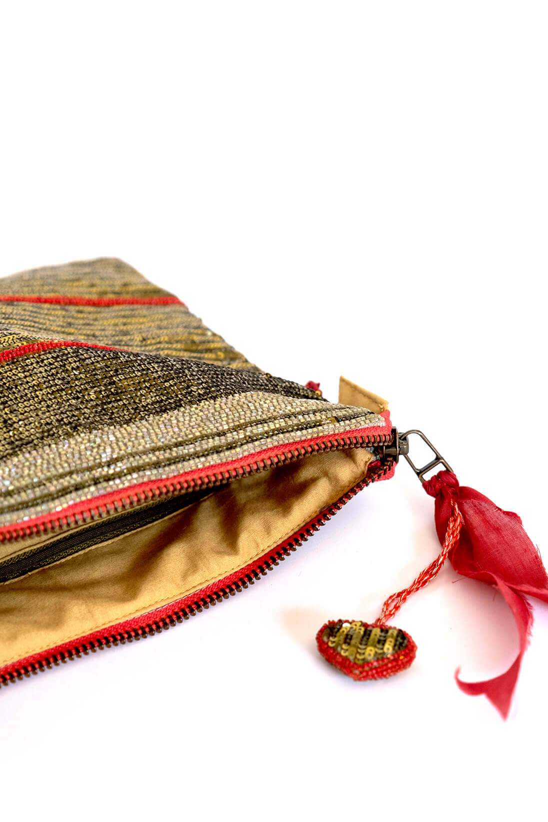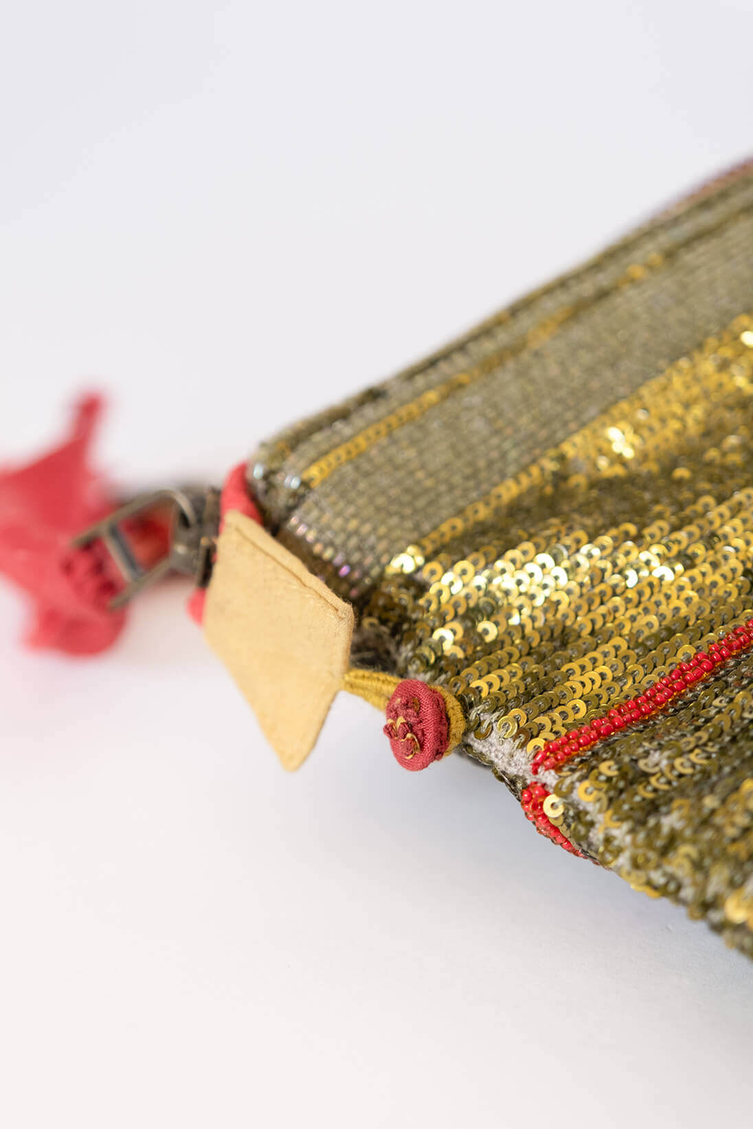 Lime green Hand embroidered linen pouches with sequins, lined with silk, equipped with metal zippers