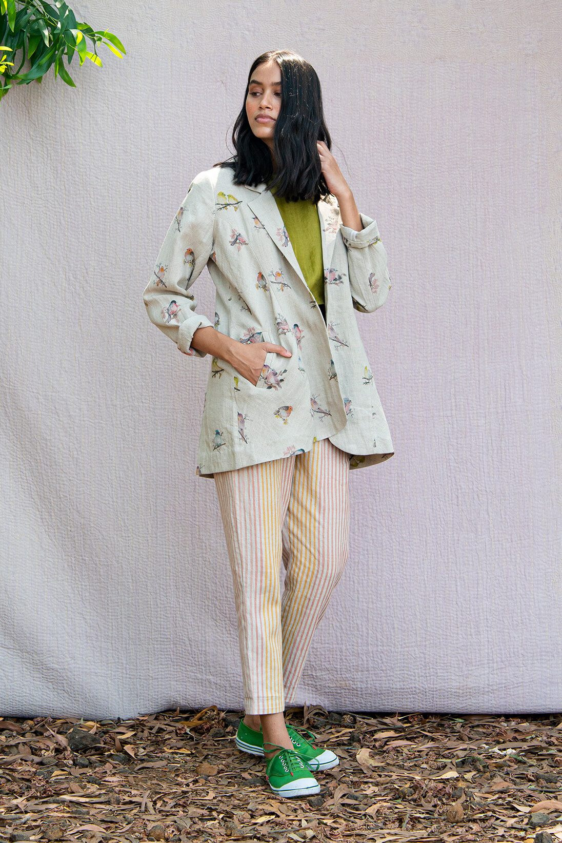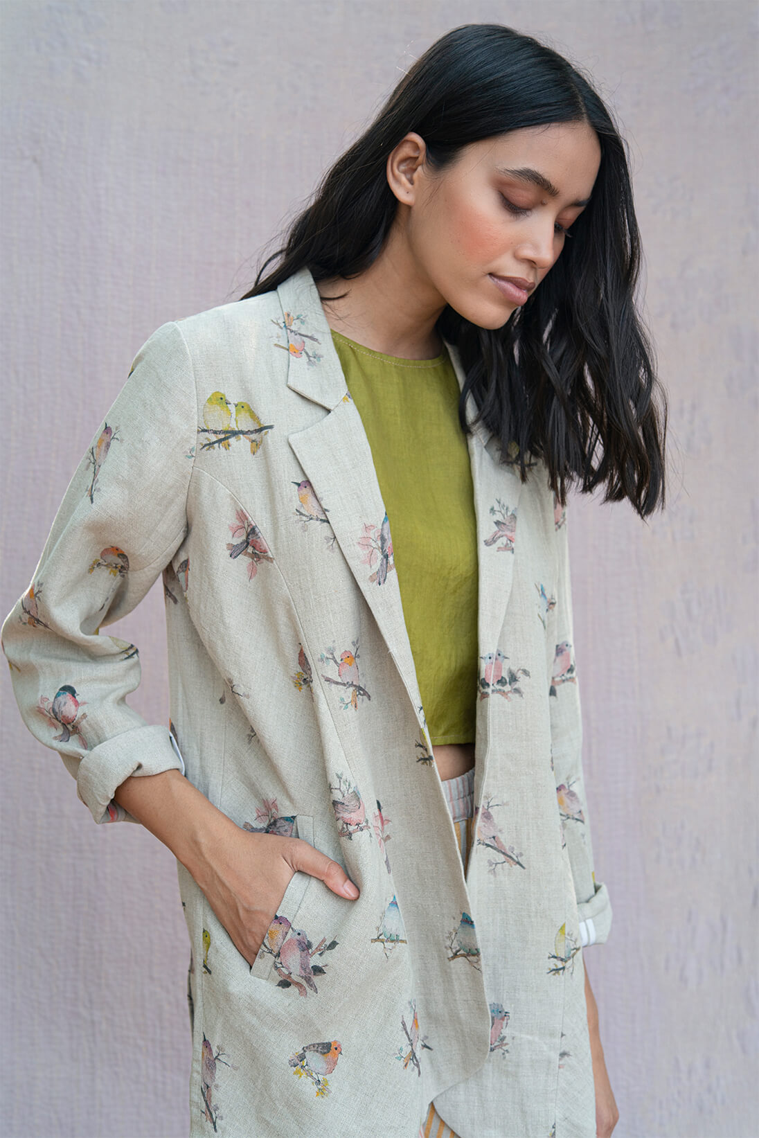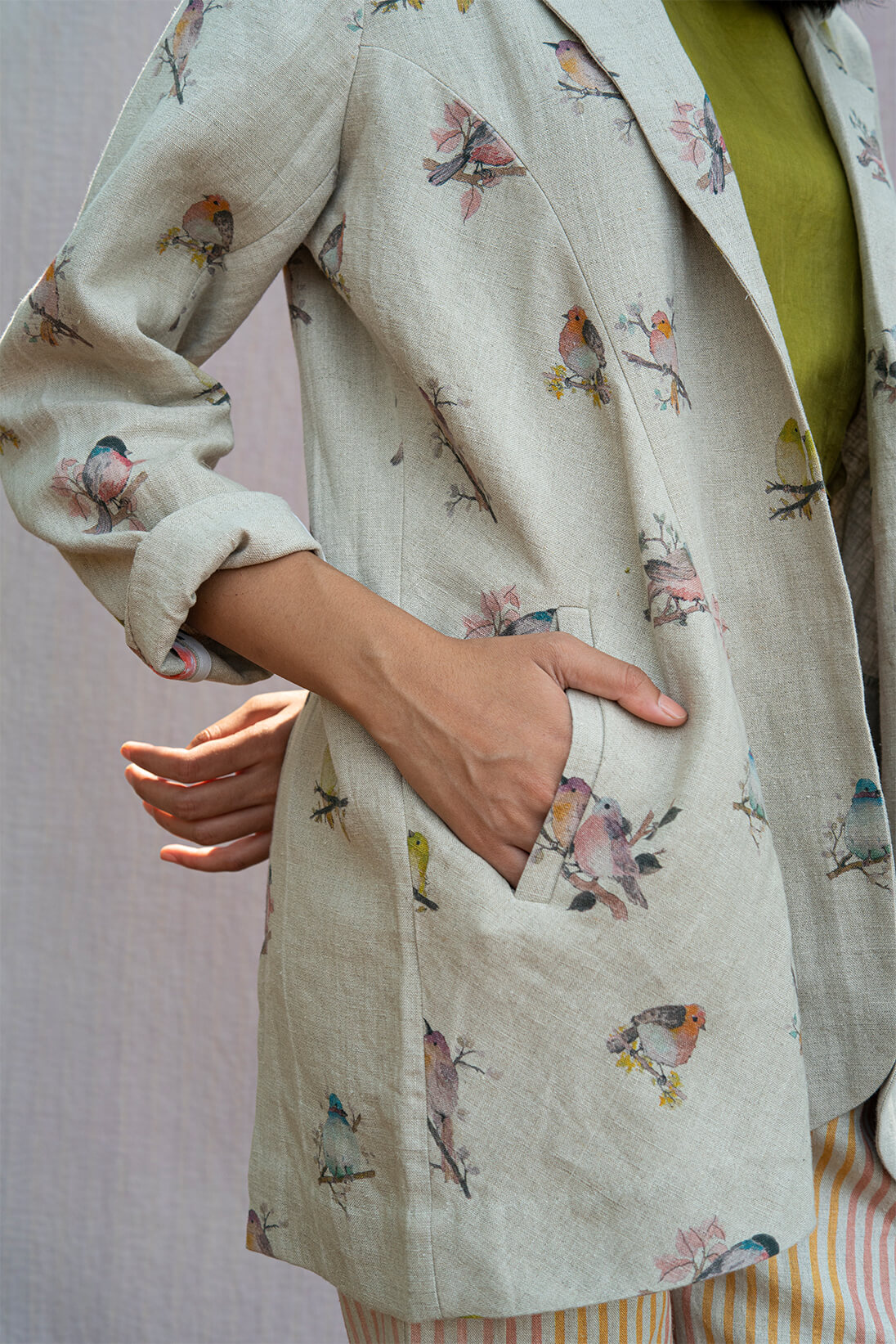 100% linen fabric with bird prints and delightful detailing on the inside makes them a perfect summer layering choice.