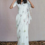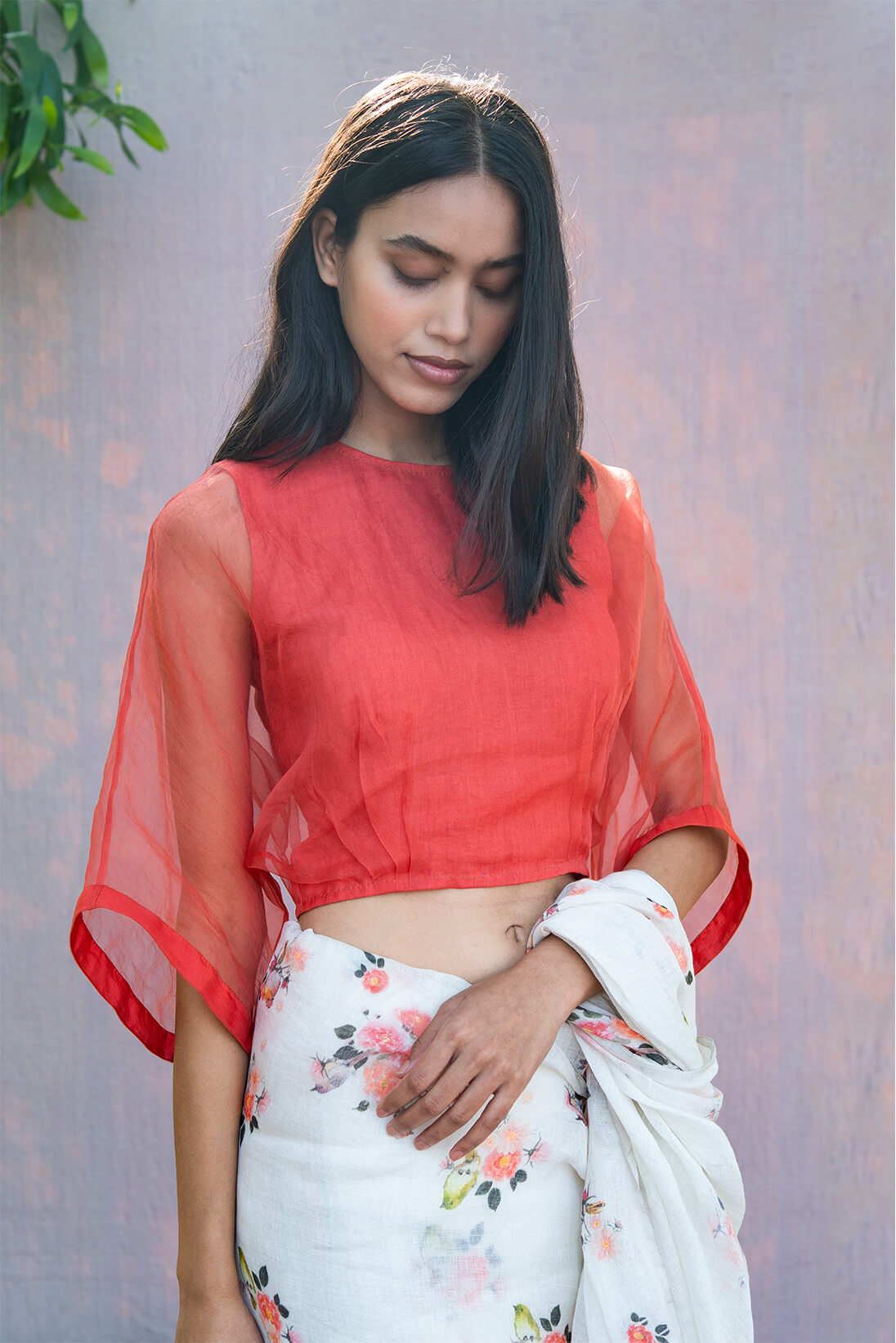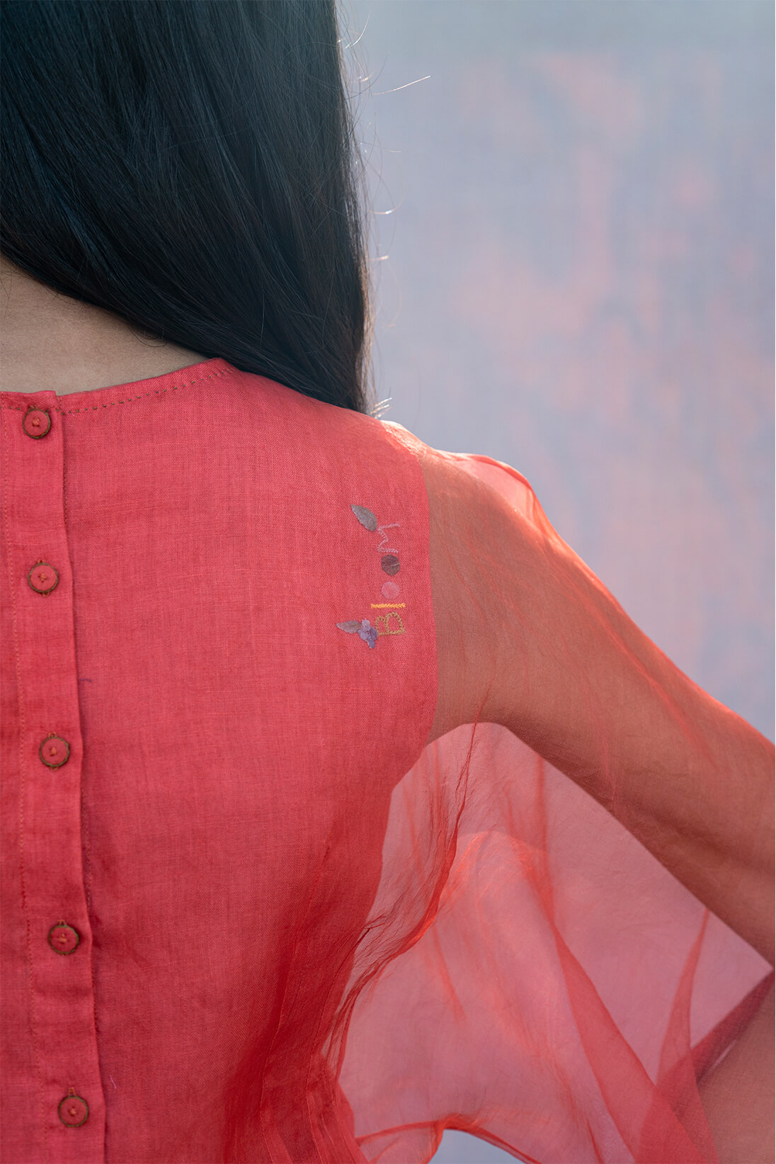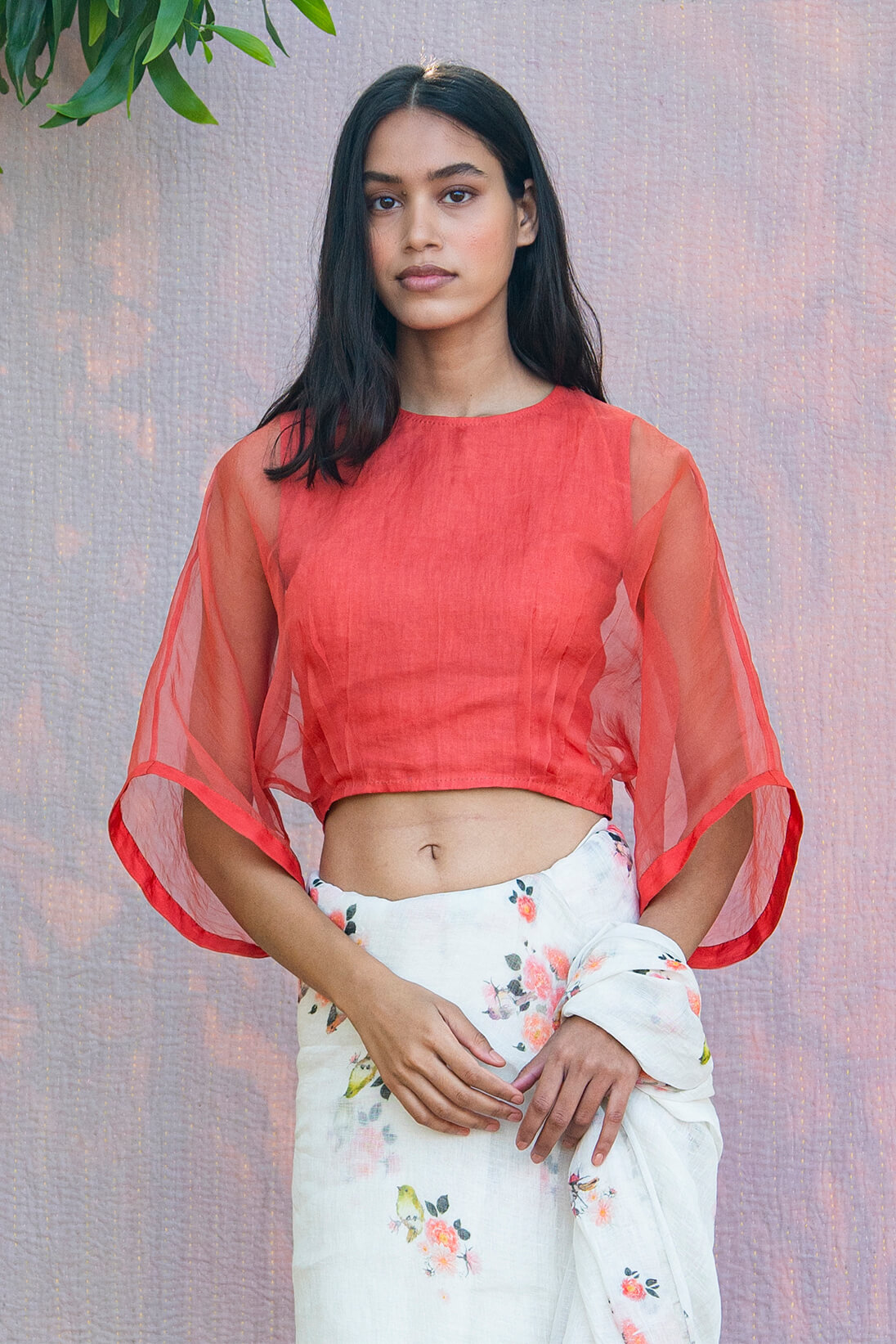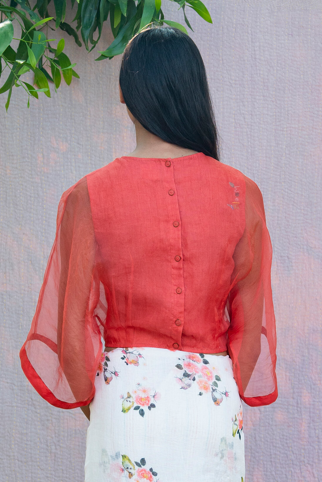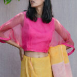 This season our kaftan blouses come in delightful summer colors. The inner shell of the blouse is 100% linen and the outer shell is silk organza. The blouse comes with hand done bloom khatwa work on the inside armhole.