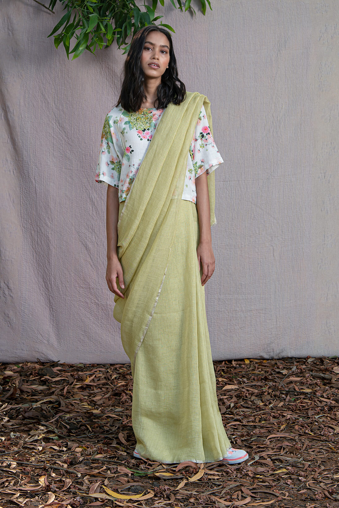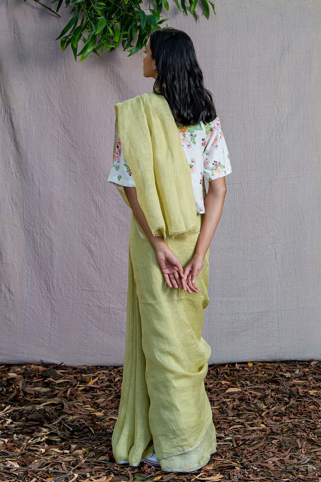 This hand woven plain linen sari comes with the silver zari selvedge. The soft color of the sari has been especially chosen for Indian summer. The sari comes with 1 meter running solid blouse. The blouse in this picture is separately available.