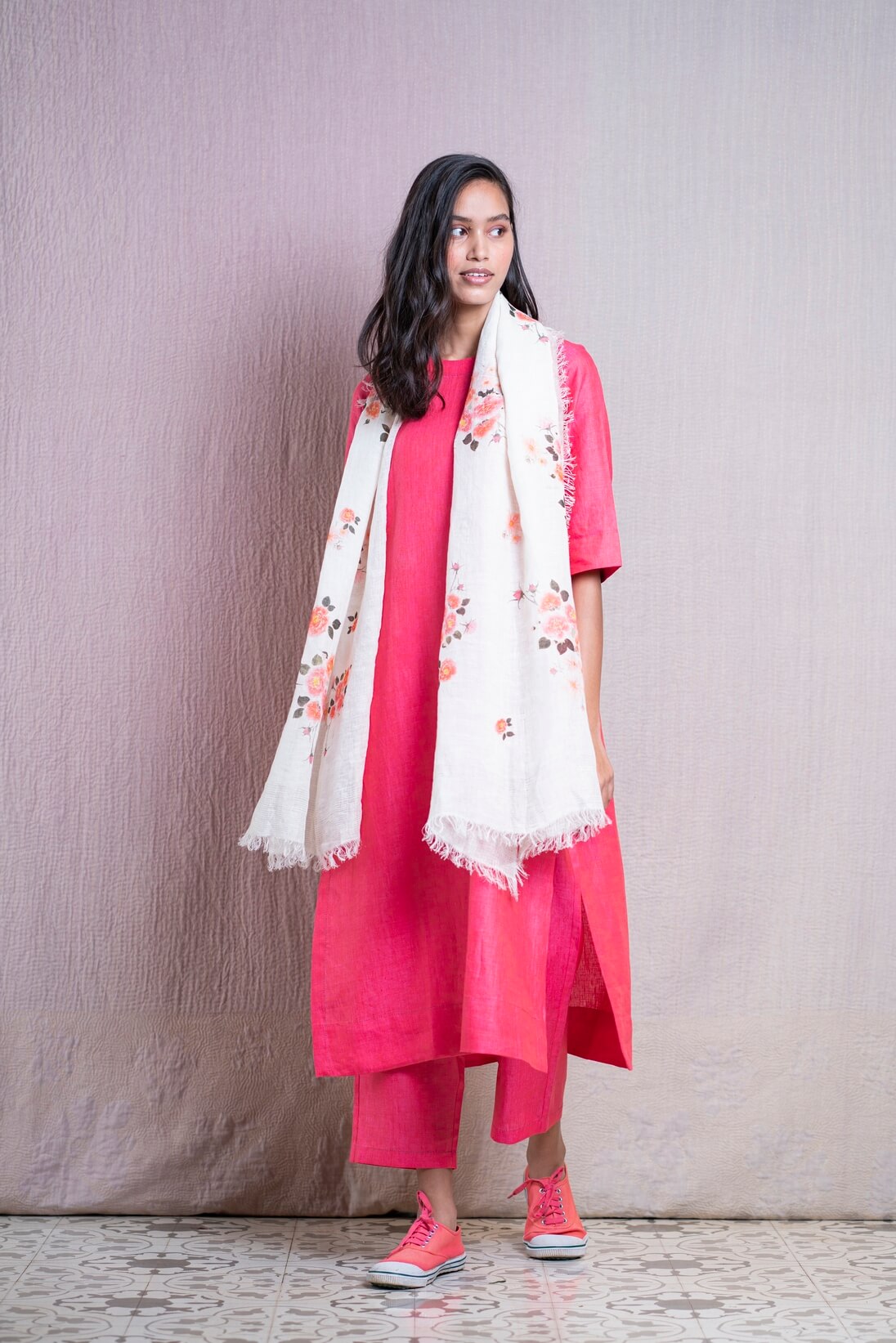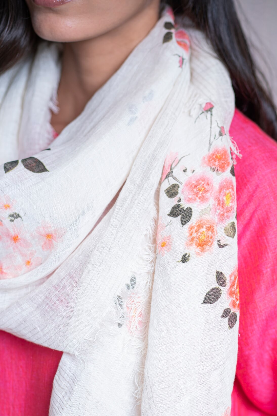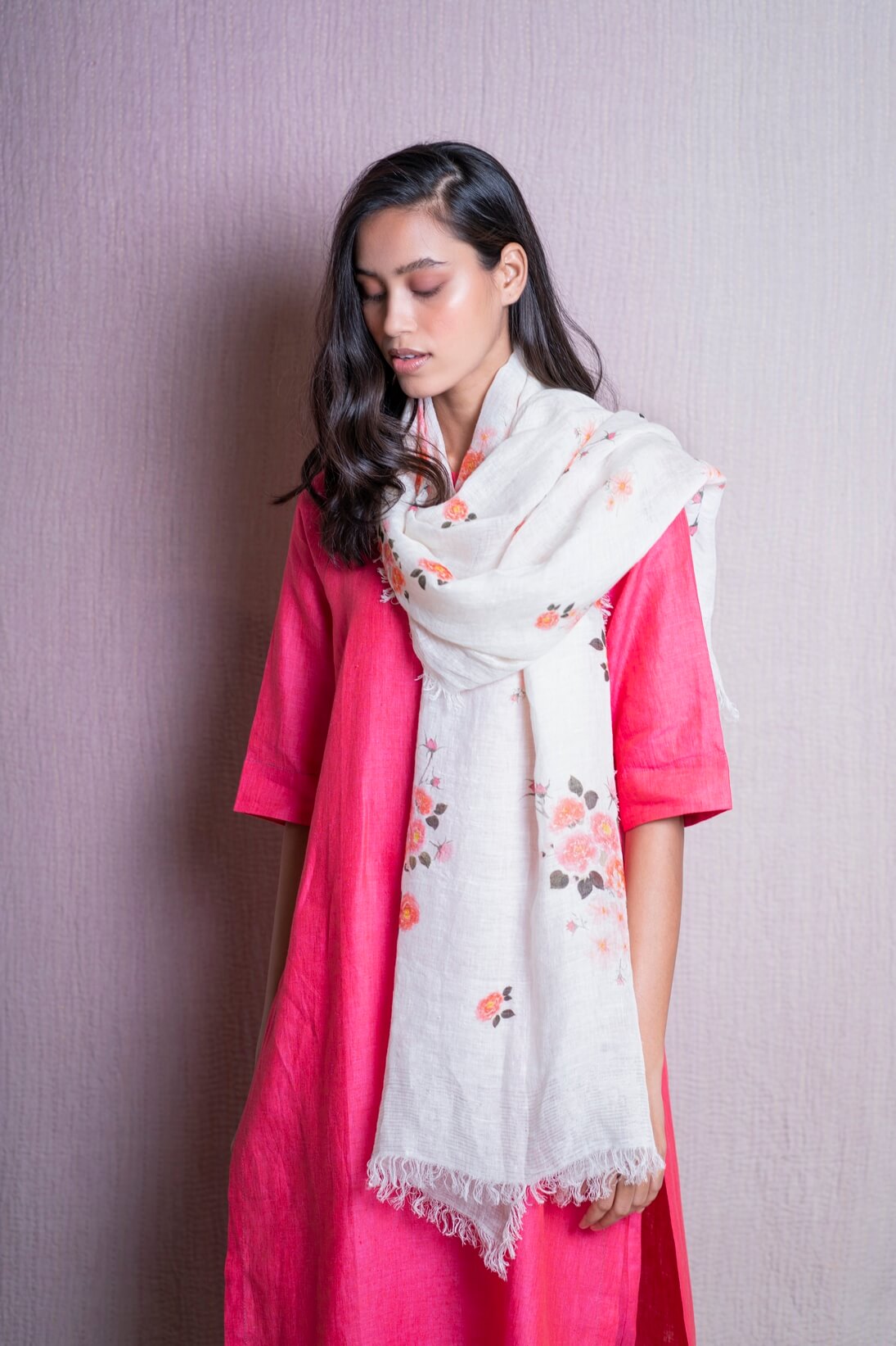 Soft ivory hand woven stoles with beautiful floral prints go well with our nova sets and burdwan set alike. It can also be teamed with summer shirts in your wardrobe.