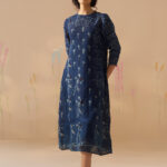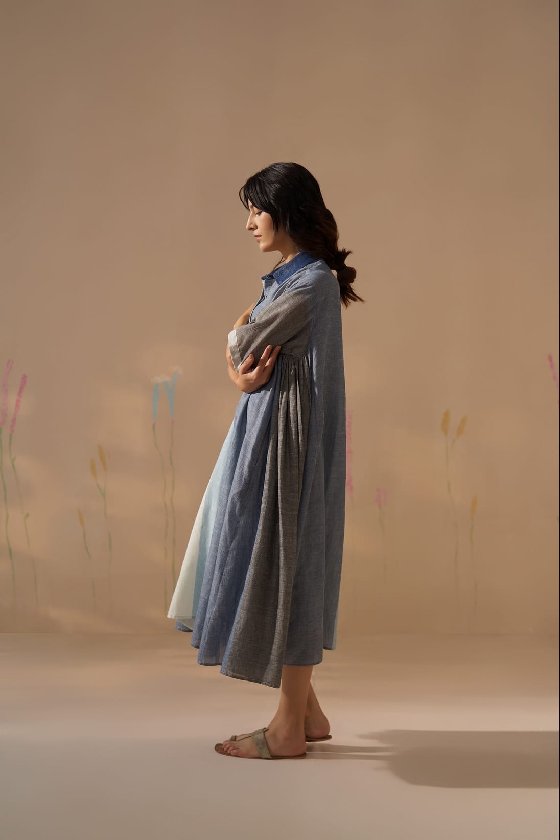 Inspired by the harmony of colors and culture, this color-blocked dress showcases the vibrancy of the cluster and the flora surrounding it. The dress features a distinctive color-blocked pattern in cool and calming colors.
