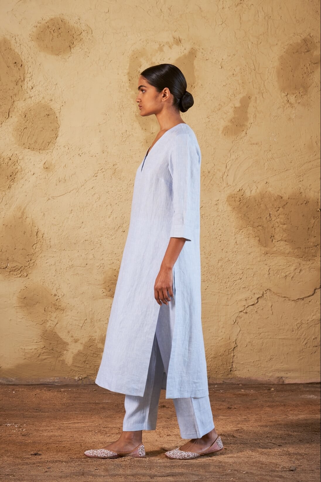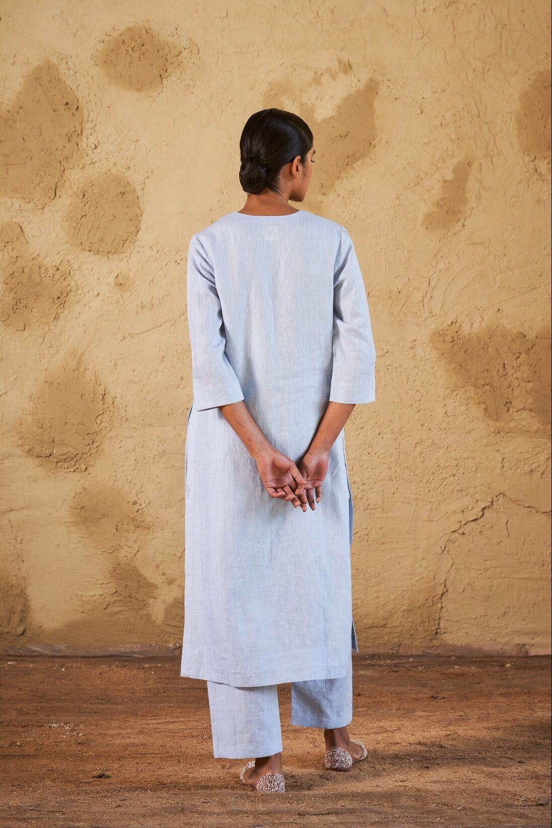 We have revisited our classic nova sets in soft chambray linen fabrics .these nova sets are detailed using silver embroidered rims on the button and hand hemming.