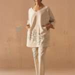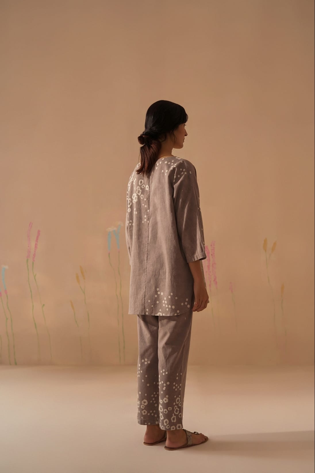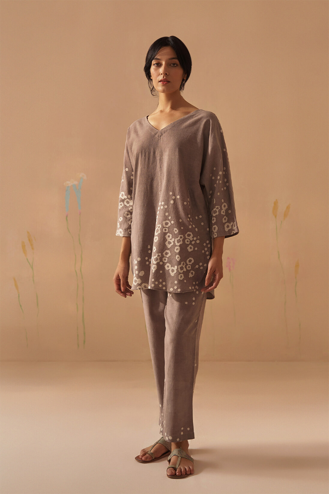 Gul, translating into flowers seen in wild as they grow in the deserted lands of the cluster. Gul pattern is printed on hand-woven textiles for this breezy summer kaftan paired with printed pants.