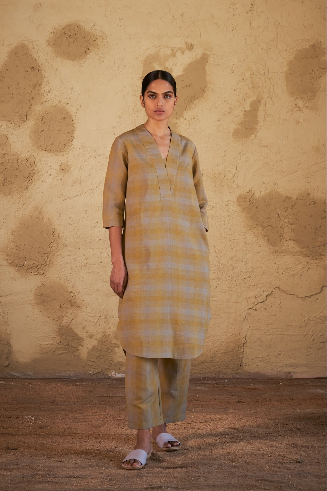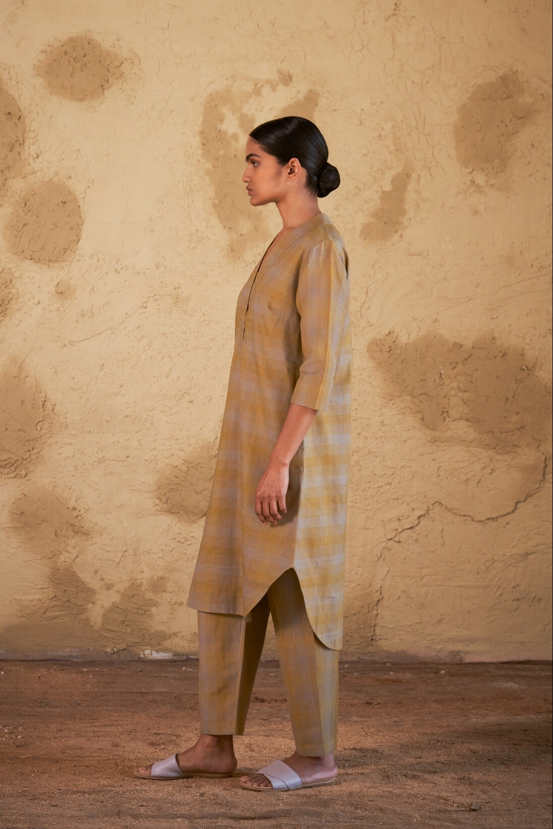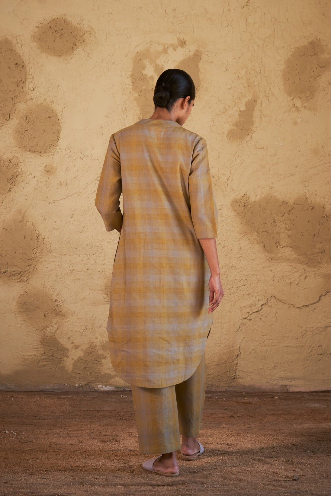 Burdwan set now a classic with us is reimagined in beautiful shades of soil and yellow giving it a washed summer look. A unique mix of western suit and Indian kurta makes this set chic and versatile.
