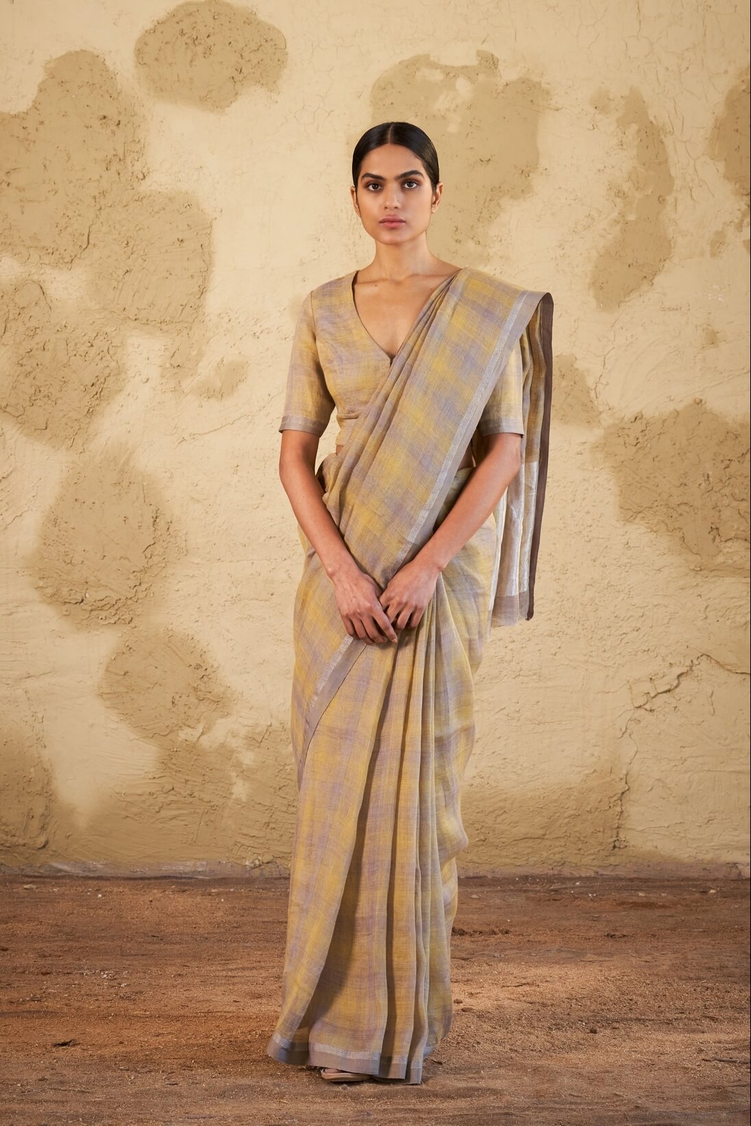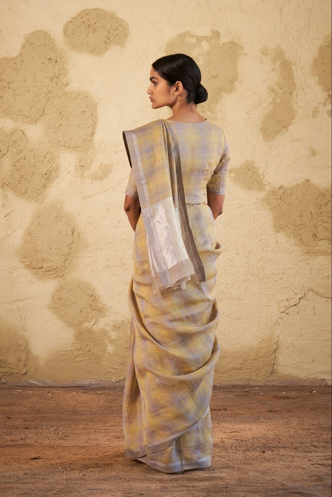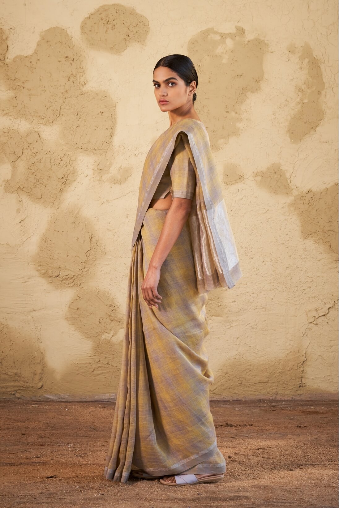 Hand woven yarndyed linen plaid sari with satin borders marked by a zari dobby and zari pallu. This sari is a depiction of dusty summer days in Indian country side. Seen here in shades of soil and yellow.