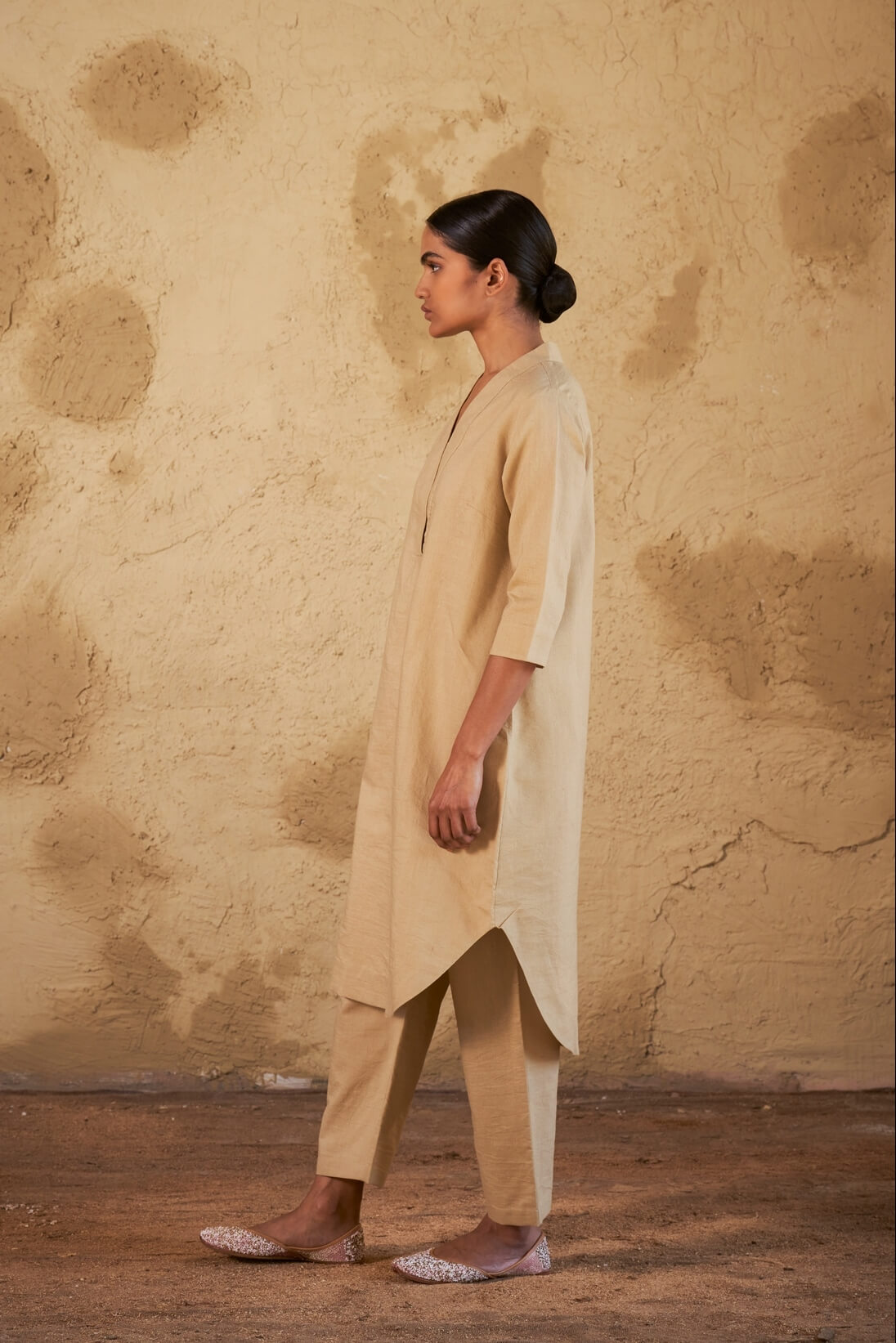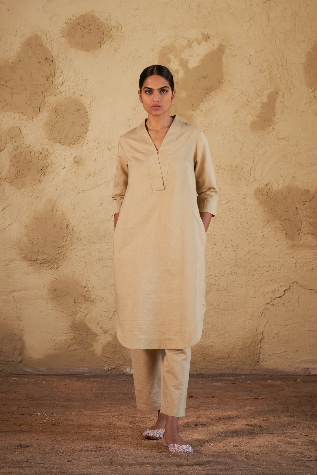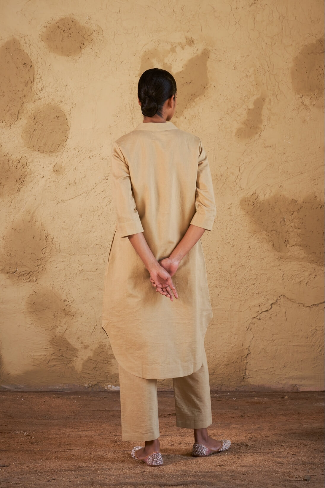 Burdwan set now a classic with us is reimagined in beautiful shades of dry soil to give it a soft summer look. A unique mix of western suit and Indian kurta makes this set chic and versatile.