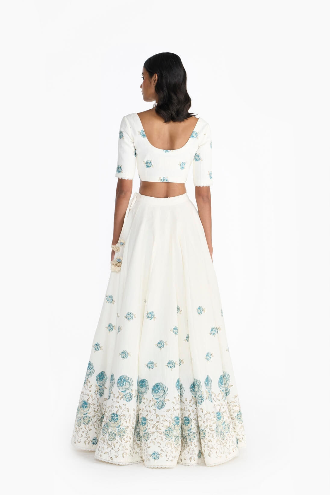 This lehenga & blouse set showcases hand block printed “”Adelle”” pattern on linen.”