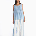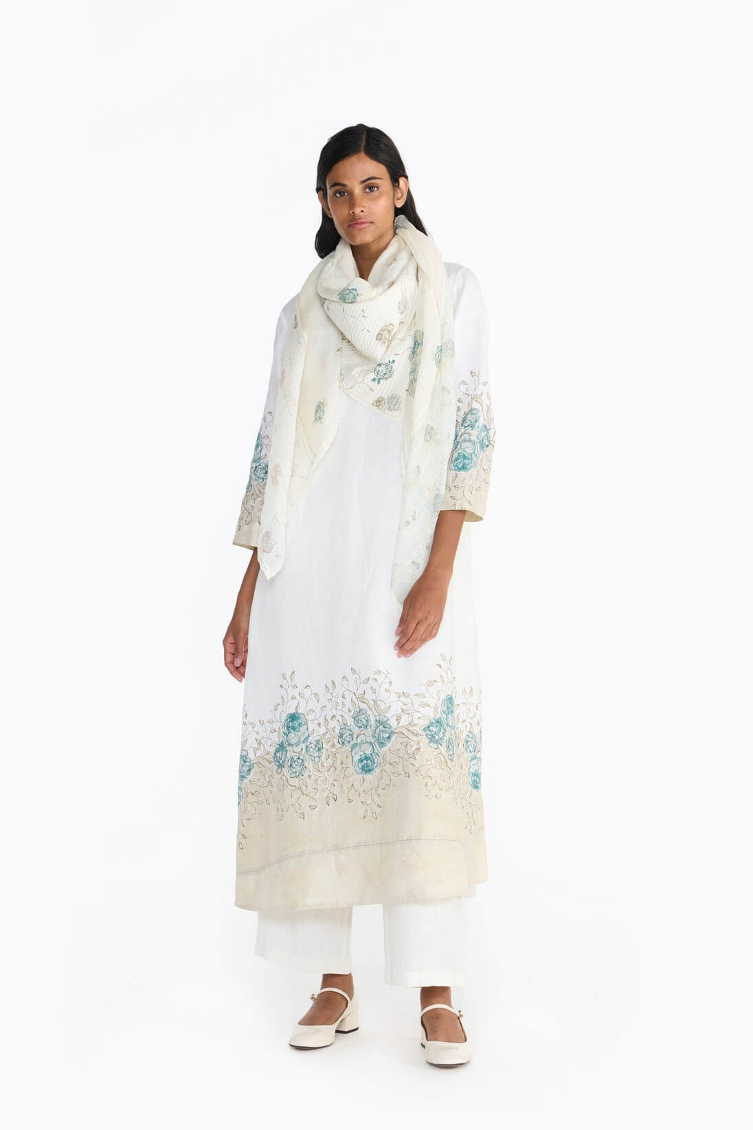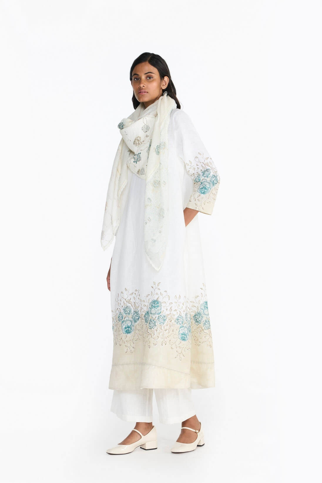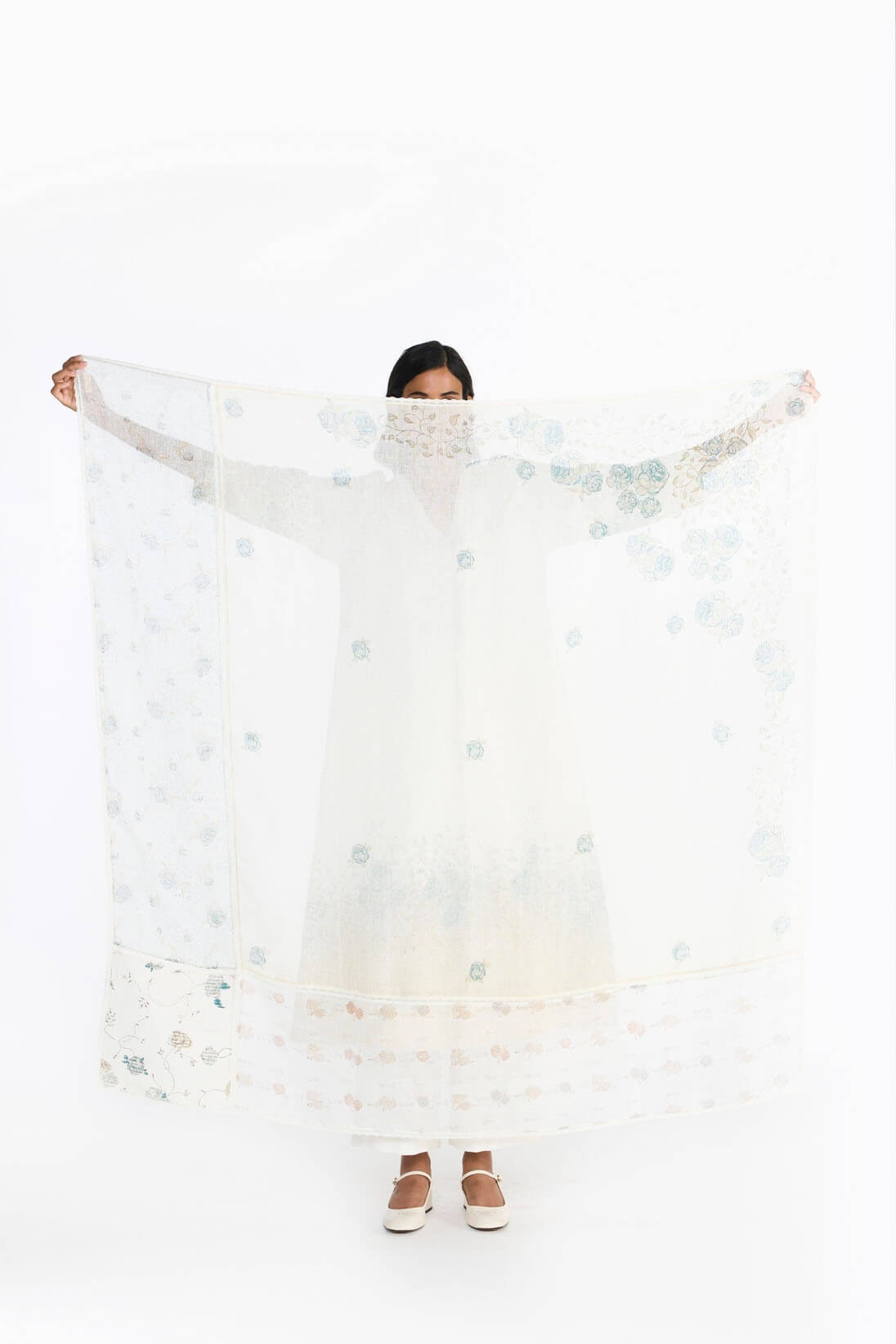“Fleur” translating to flower, this scarf includes, trellises, cordons, eleanor & blooming patterns in block print. This square voluminous scarf connects everything together with fine faggoting stitches, hand embroidered crochete & delicate laces