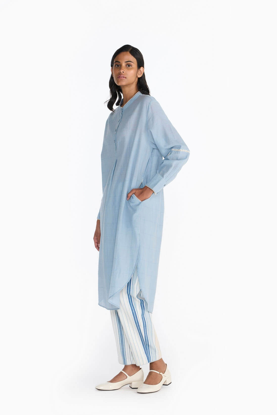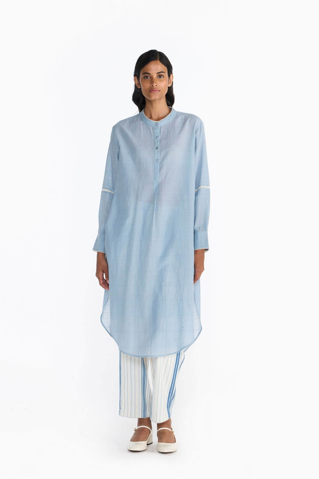 Bringing back the quintessential, kameez shirt keeping our ethos of comfort and ease intact. Our roomy shirt features a unique woven self-striped pattern. Made from soft khadi this shirt features lace joineries & hand embroidered deatils.