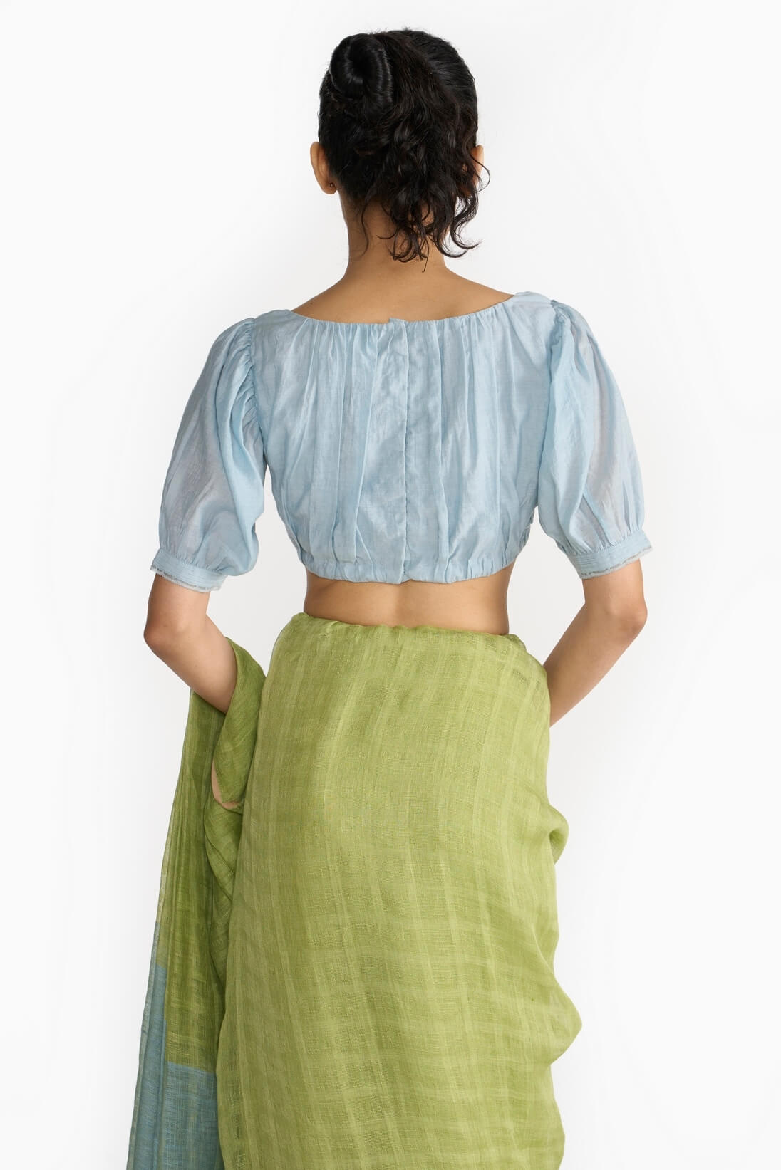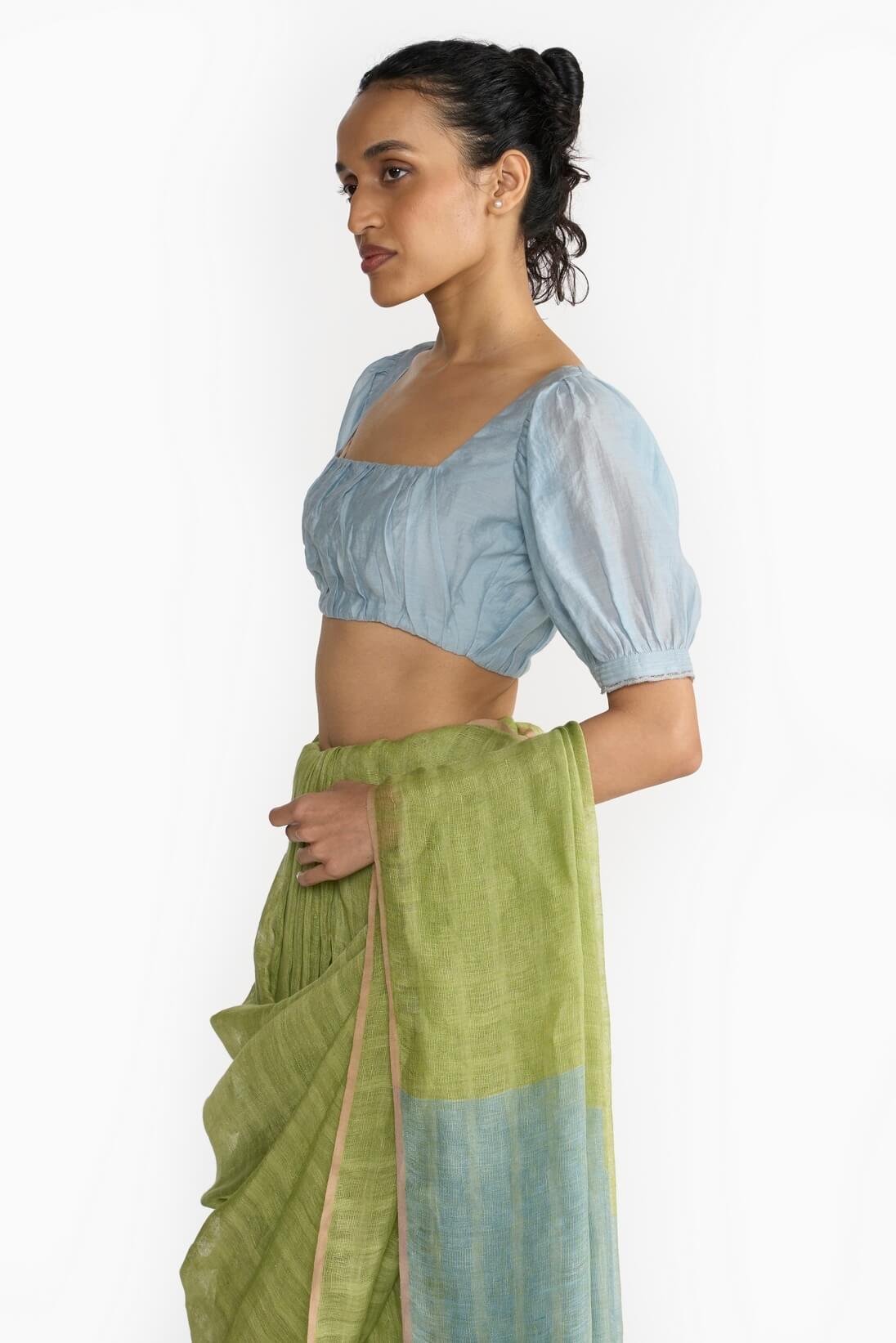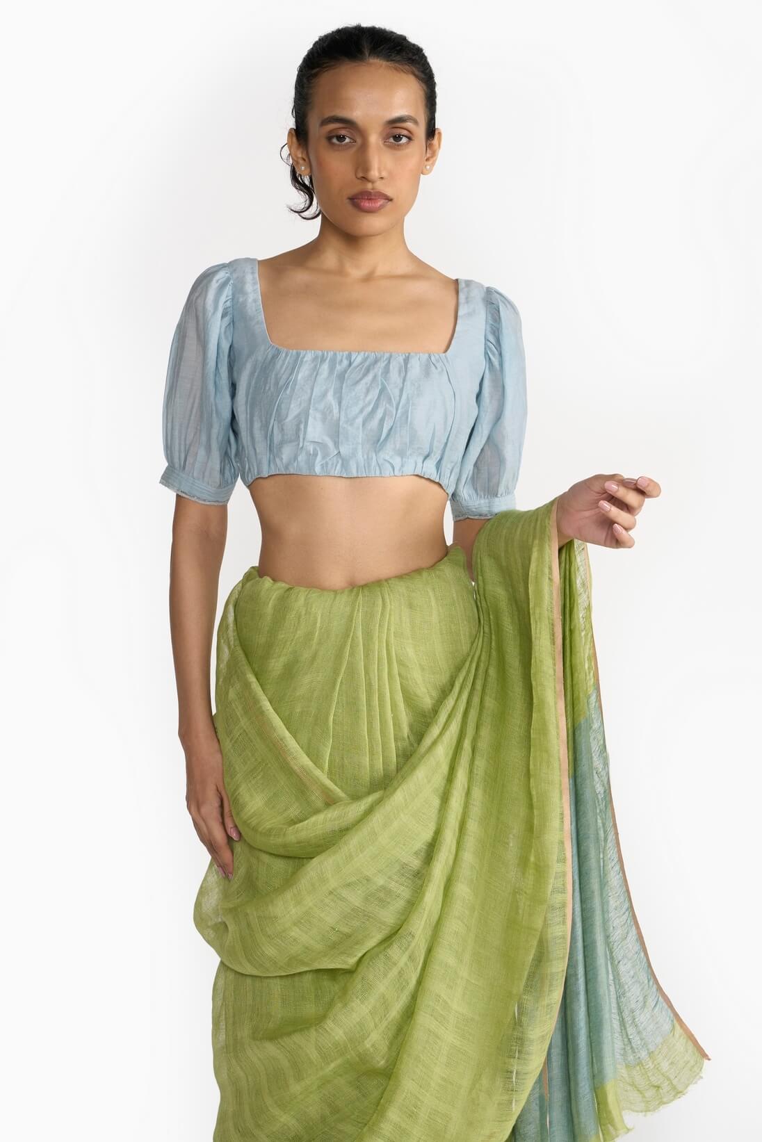 “Riviera” is a blouse inspired by the vinatge regency era dresses with empire waistline and soft gathered look. Made in fine khadi silk this blouse features a square neckline & finished with french laces.