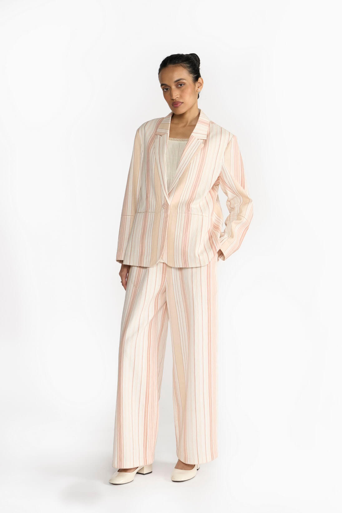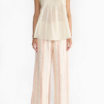 Khadi denim wide leg trousers woven with a monochrome striped pattern and finished with delicate laces. this silhouette has an easy fit with pockets and an elasticated waistband.