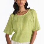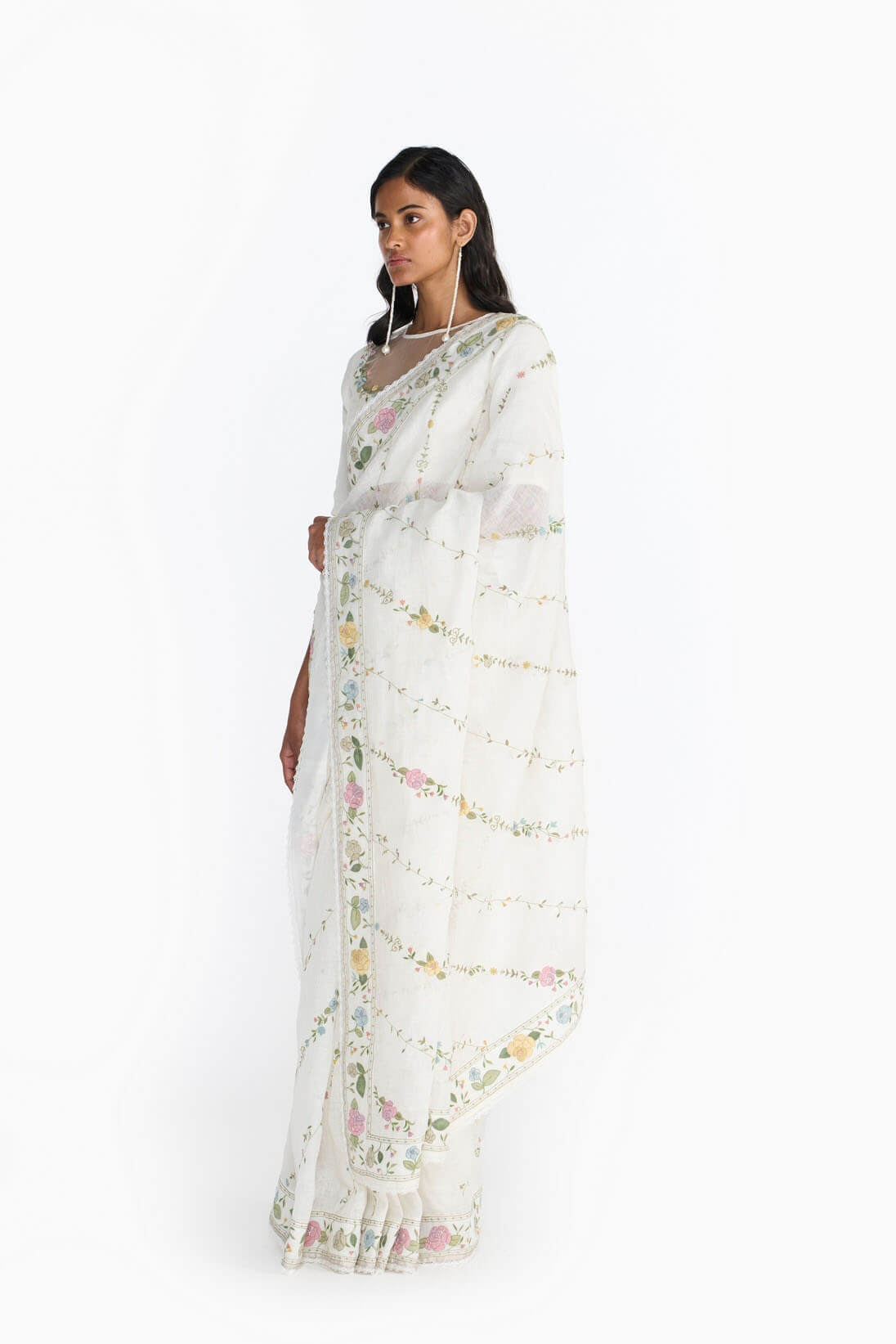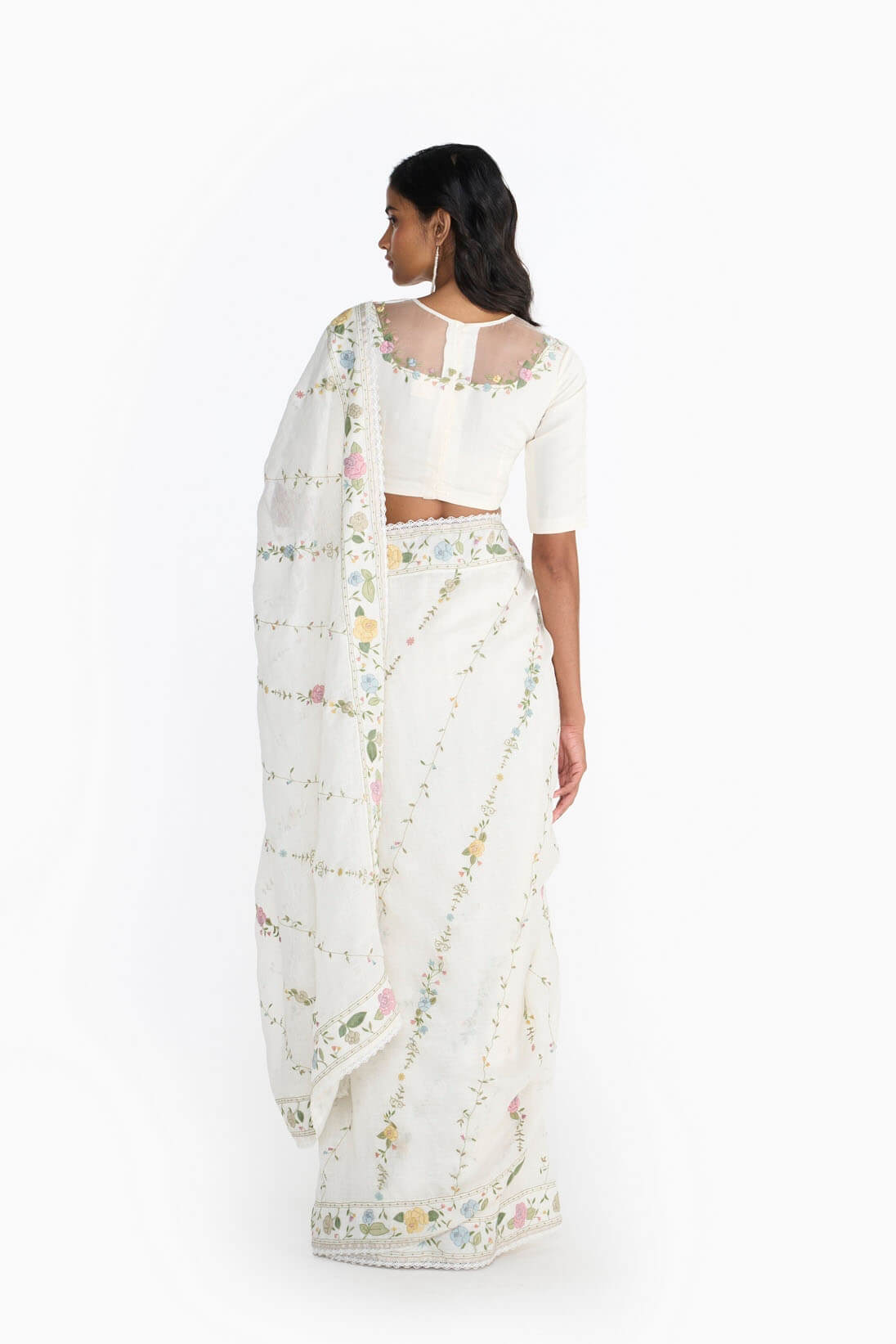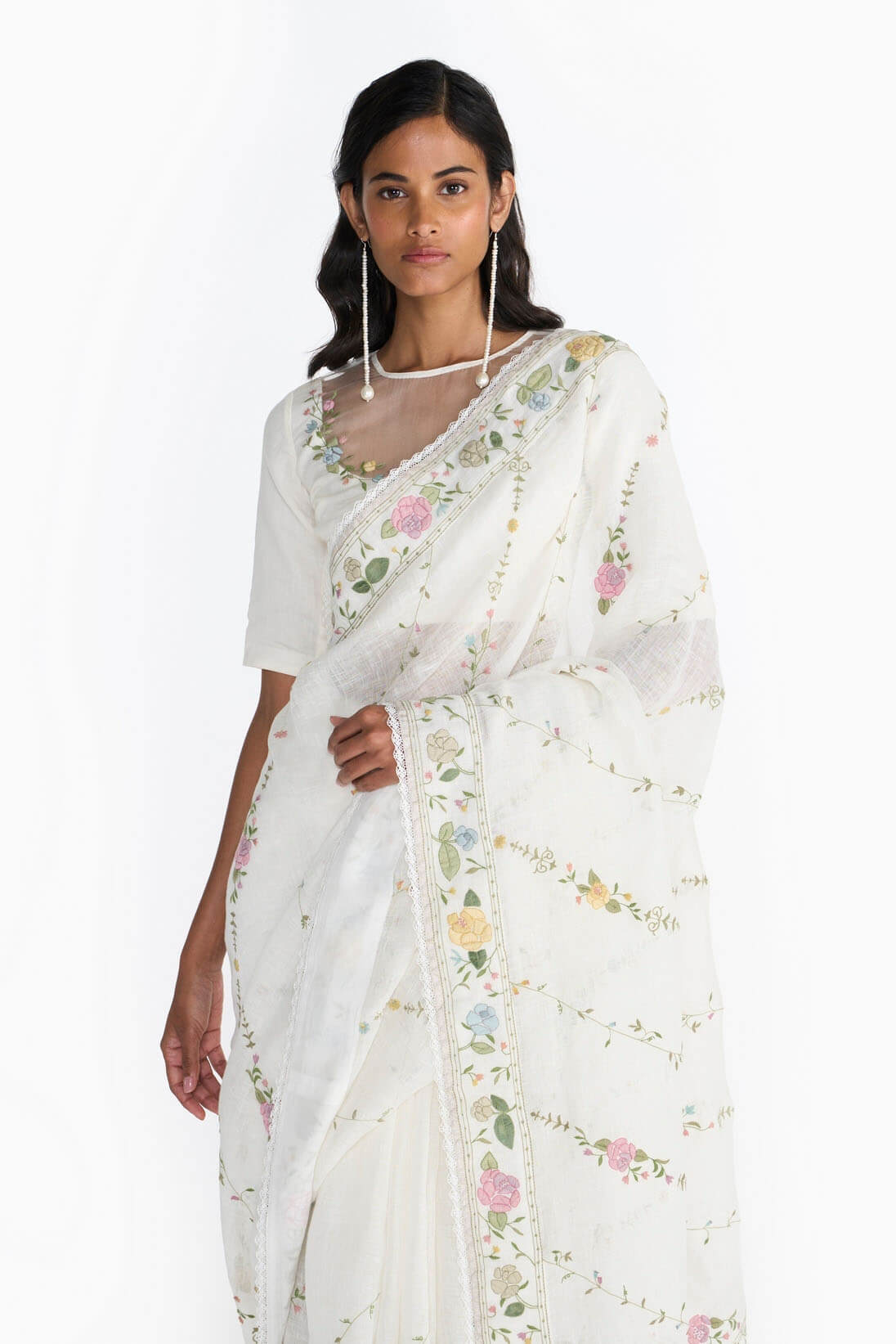Colette Applique Sari features delicate hand embroideries and meticulouly crafted applique roses on our classic white linen sari. White base framed with a border & lattice jaal of colors from the gardens of indo-french riviera, smoke blue, blush, soft yellow & green to recreate the feeling of a rosarium.
