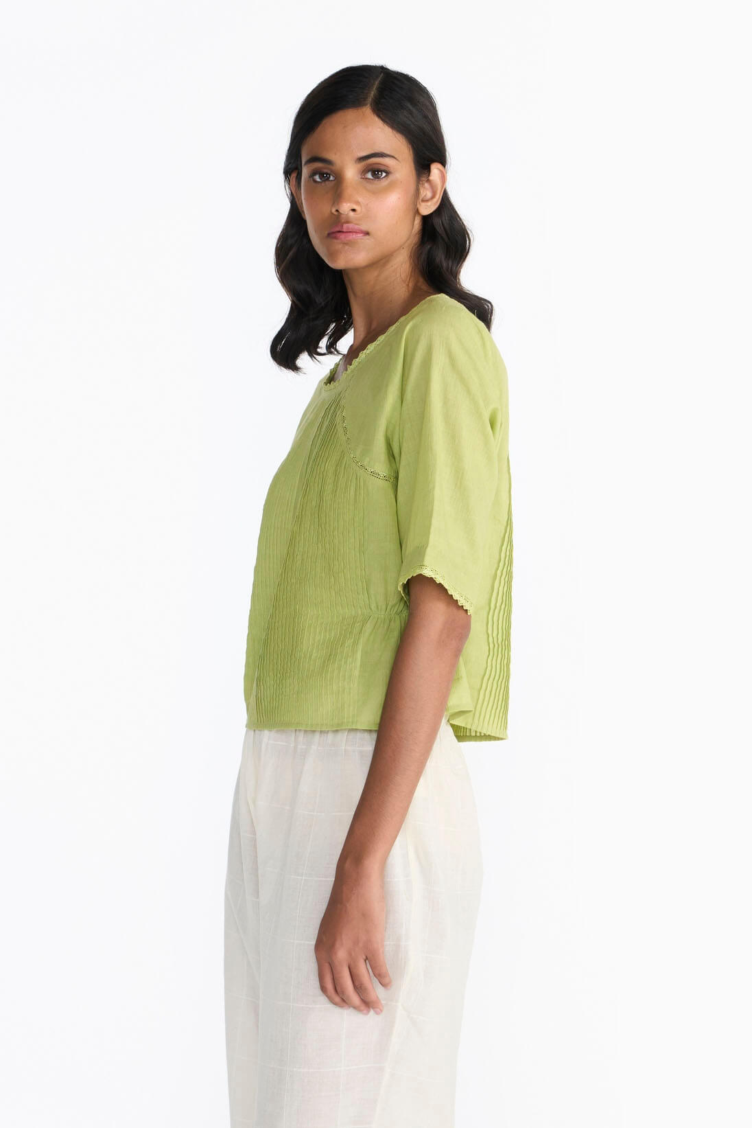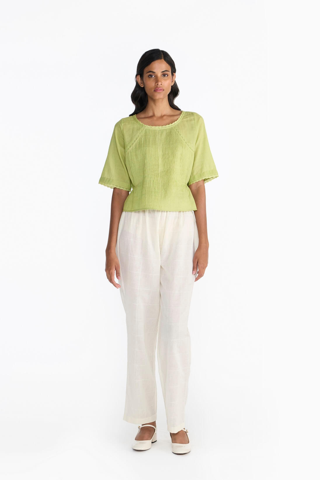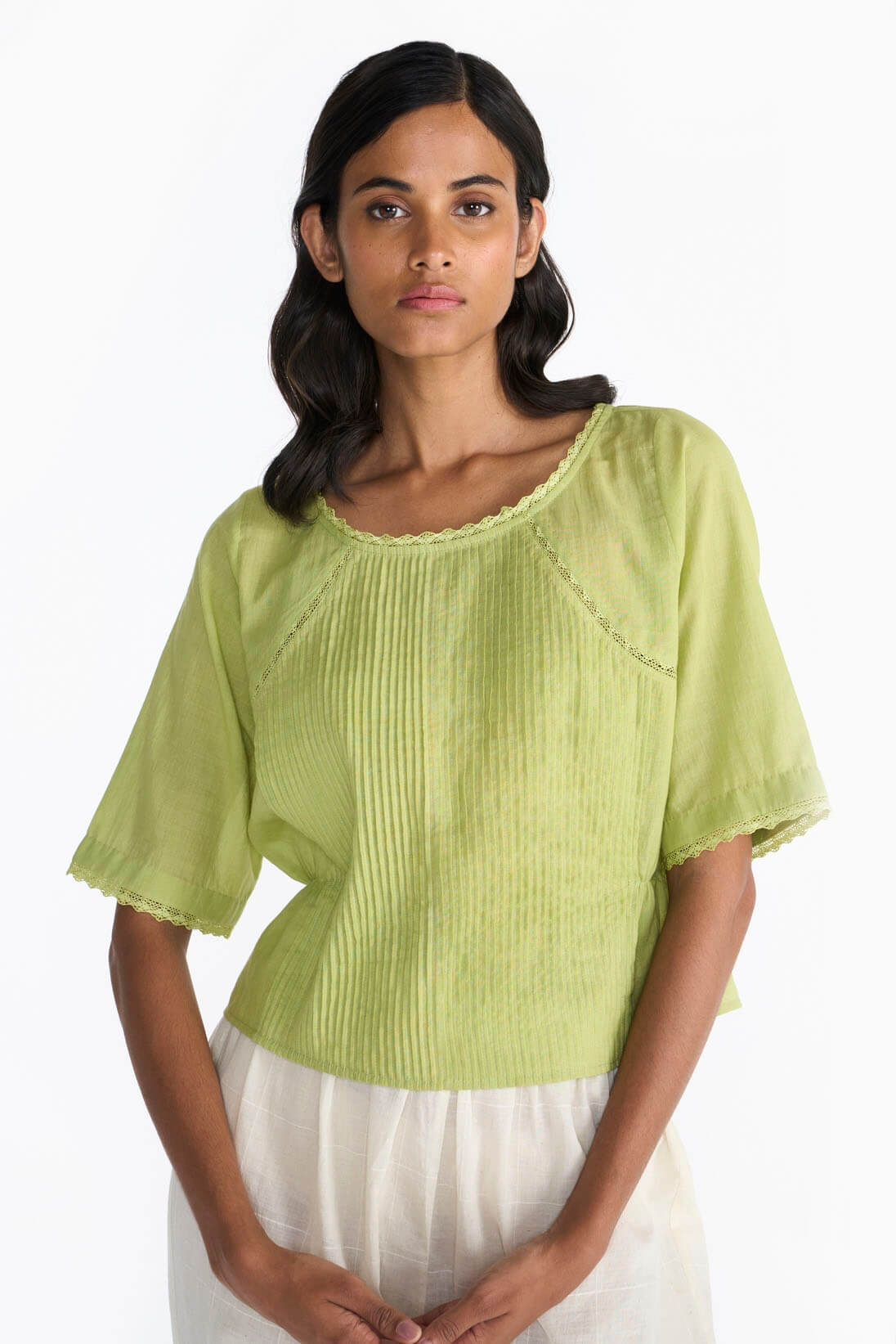 Clé blouse emphasizes the tailoring skills by creating a fine blind tuck yoke & flared hemline. This piece is finished with delicate laces and hand emboridery.