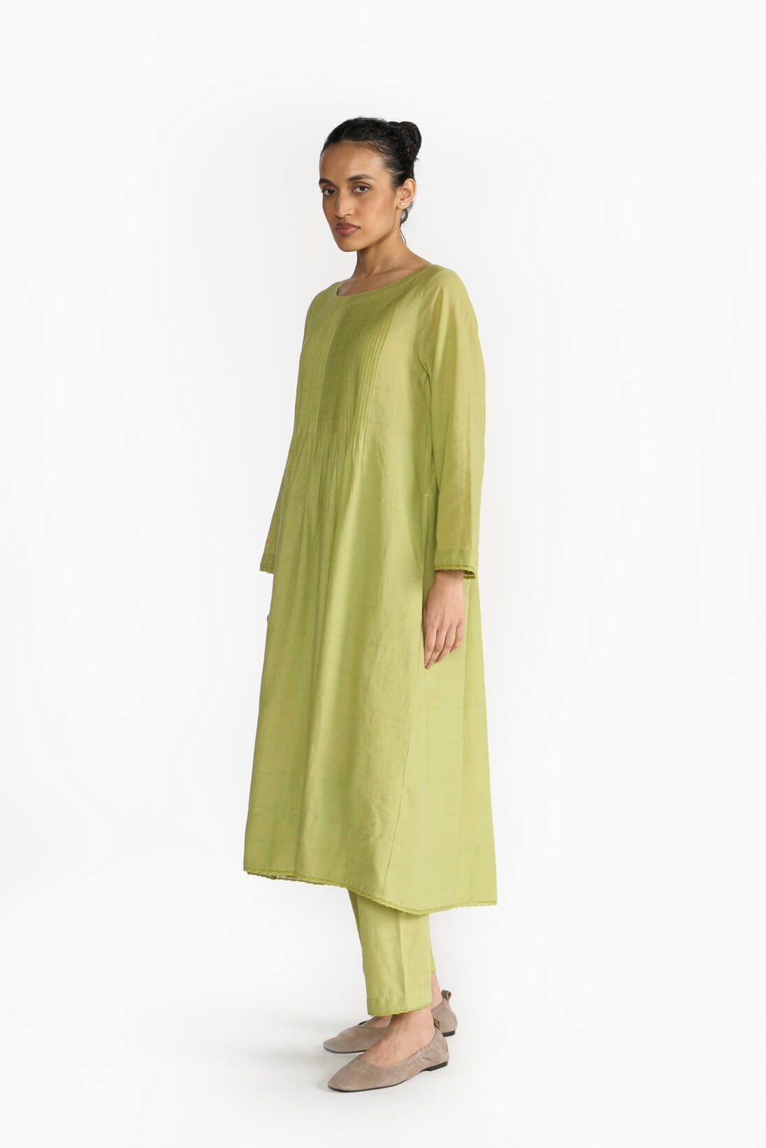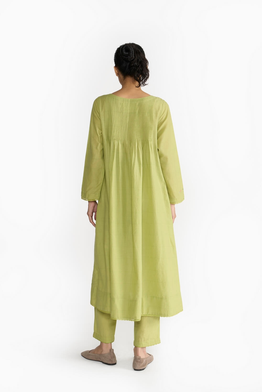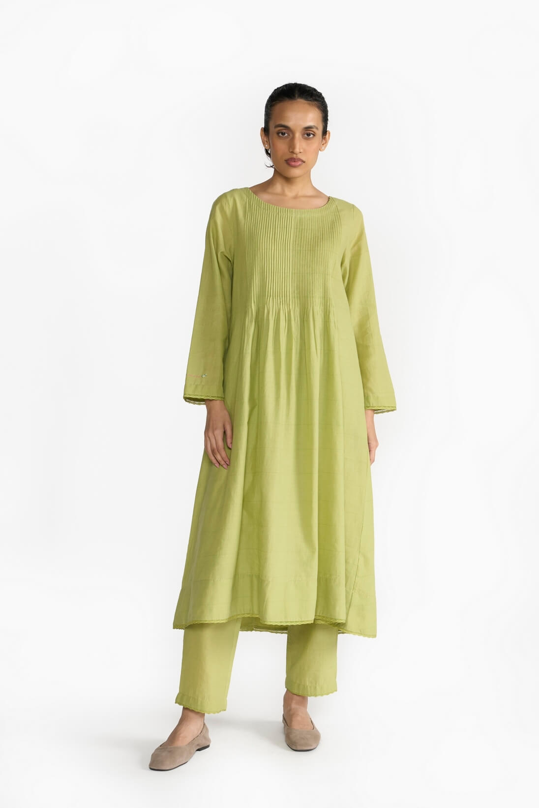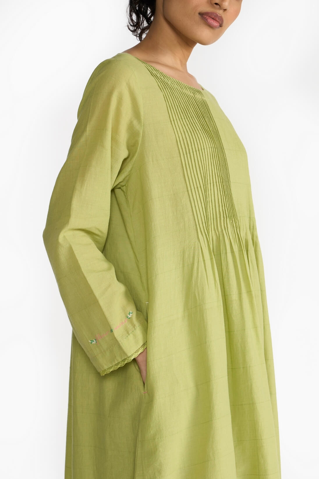 Emilie Tunuc focuses on the sewing skills by creating a blind tuck yoke & flared hemline. Made in fine khadi, the piece is finished with delicate laces and hand emboridery.
