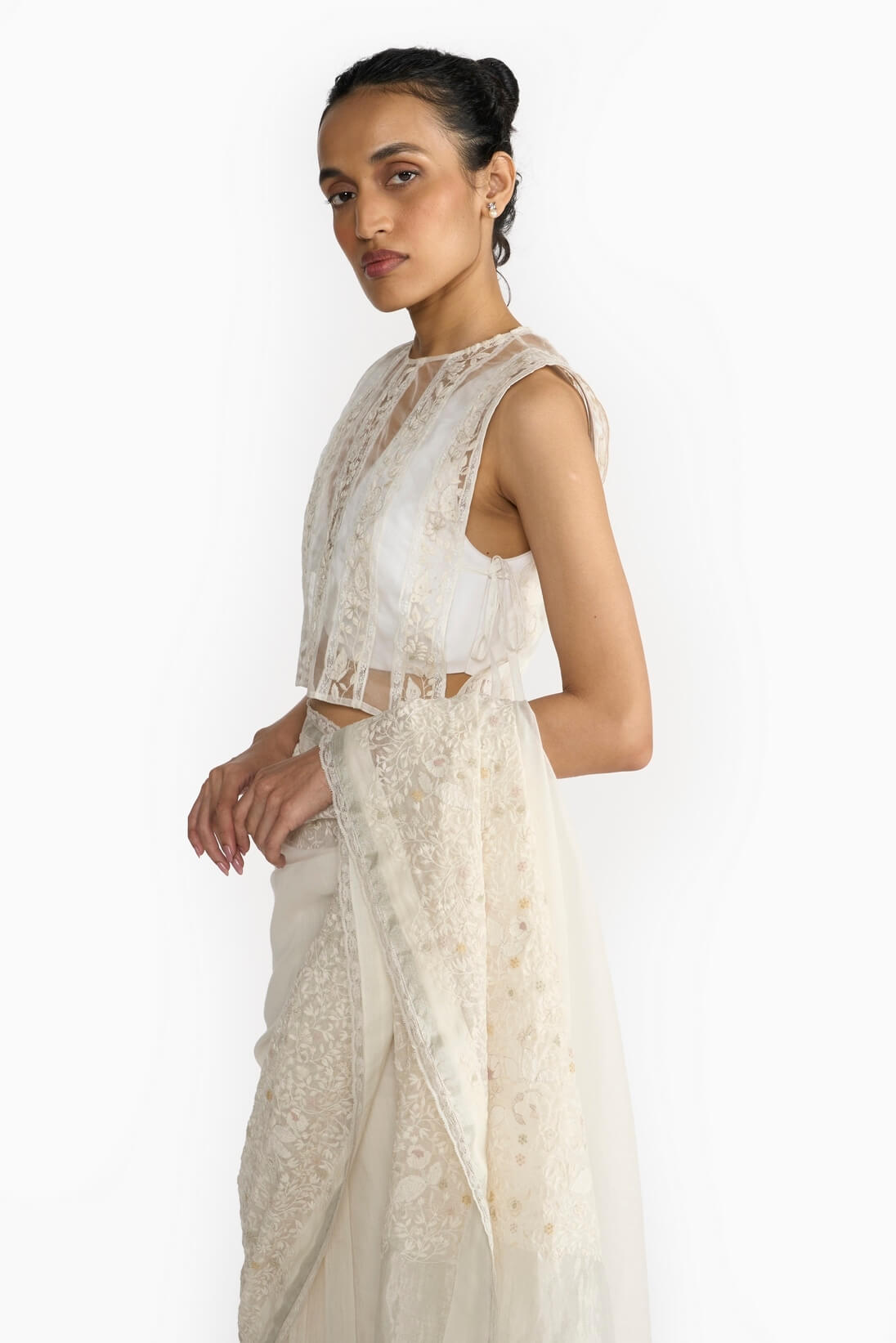 été Embroidered Blouse, is a combination of a French Bavoir & a linen sleeveless blouse. The bavoir, medieval french over-layer showcases delicate craftsmanship with skill full hand embroidery and tailoring. Intricately embroidered floral motifs adorn the sheer panels, adding a touch of whimsy with lace details.