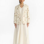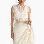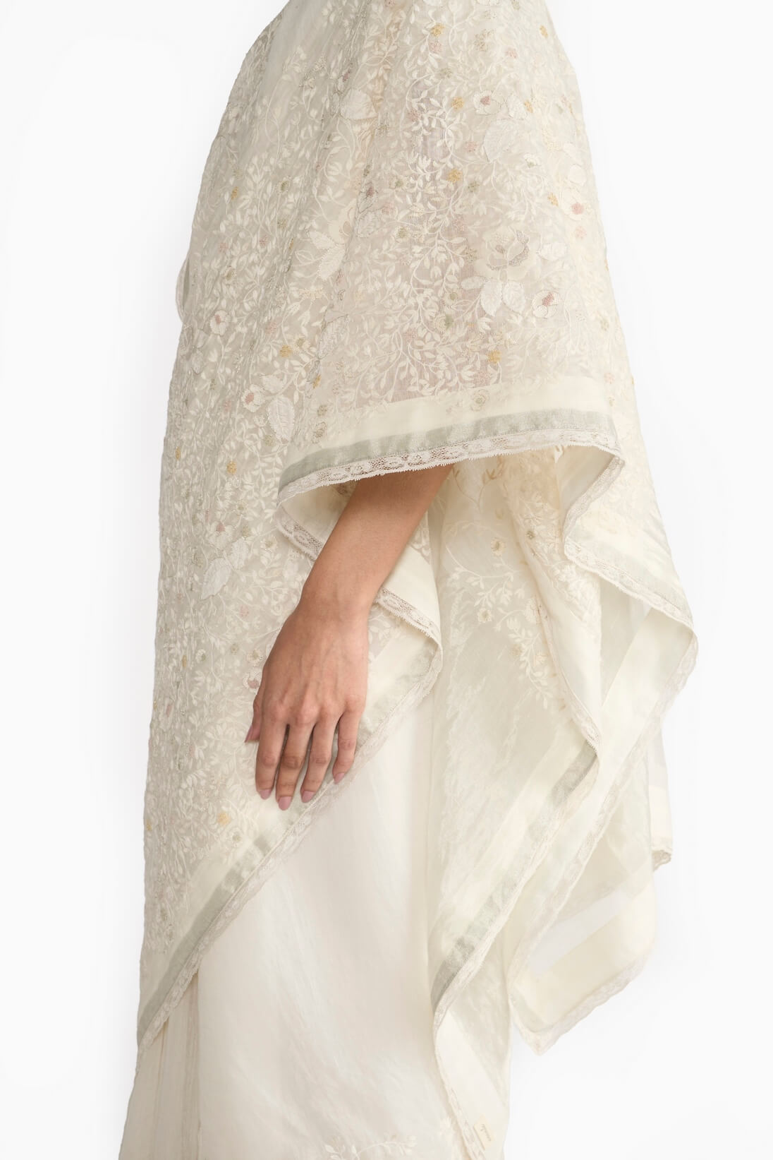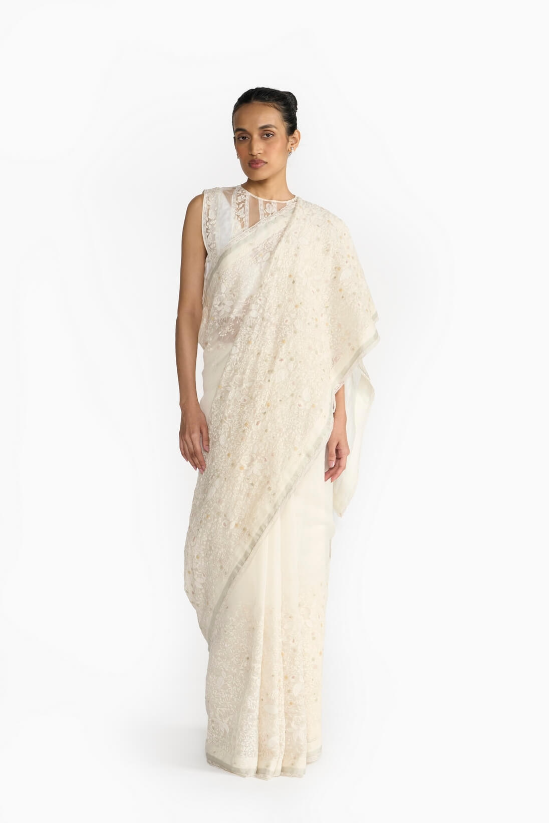 été Embroidered Sari, captures the essence of “fleur d’amour”. An epitome of summer luxury, this khadi silk sari is completed by a team of skillful applique artisans and hand embroiderers in 150 days (1200 working hours) .