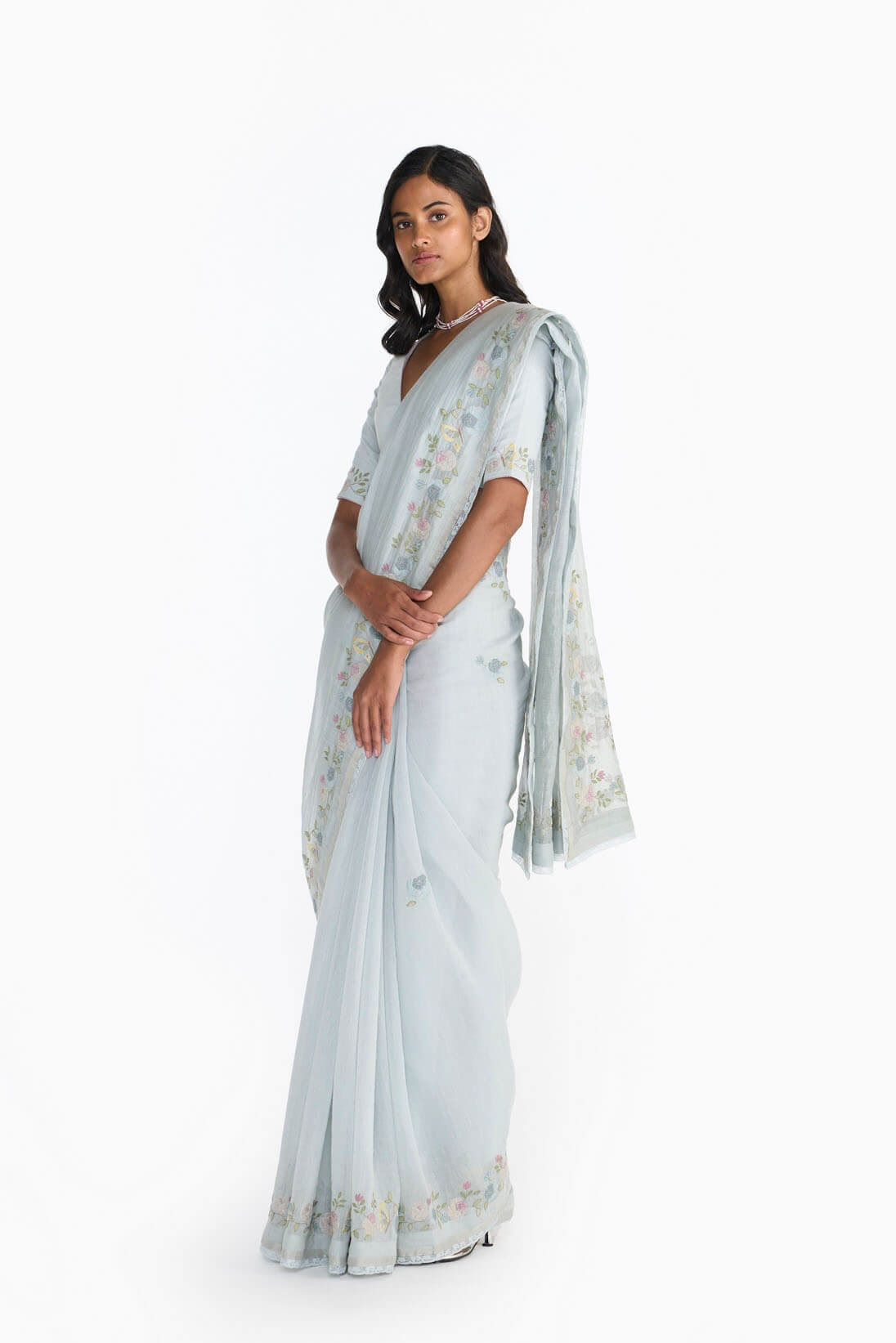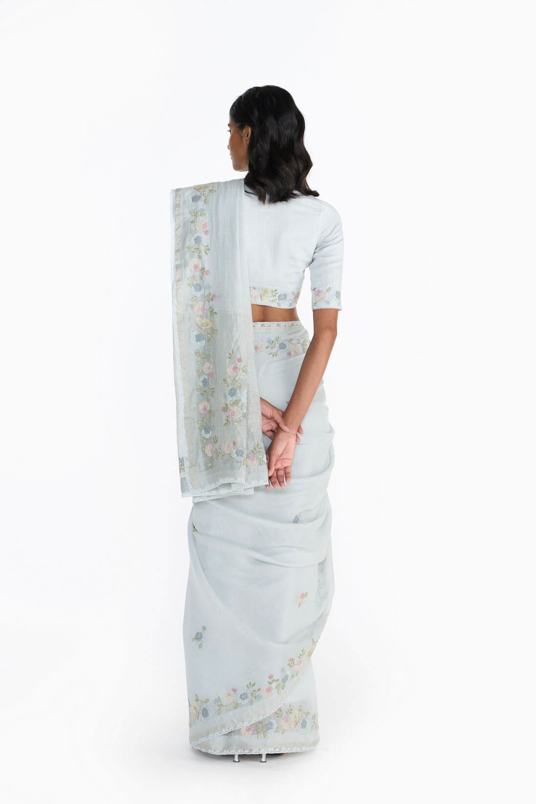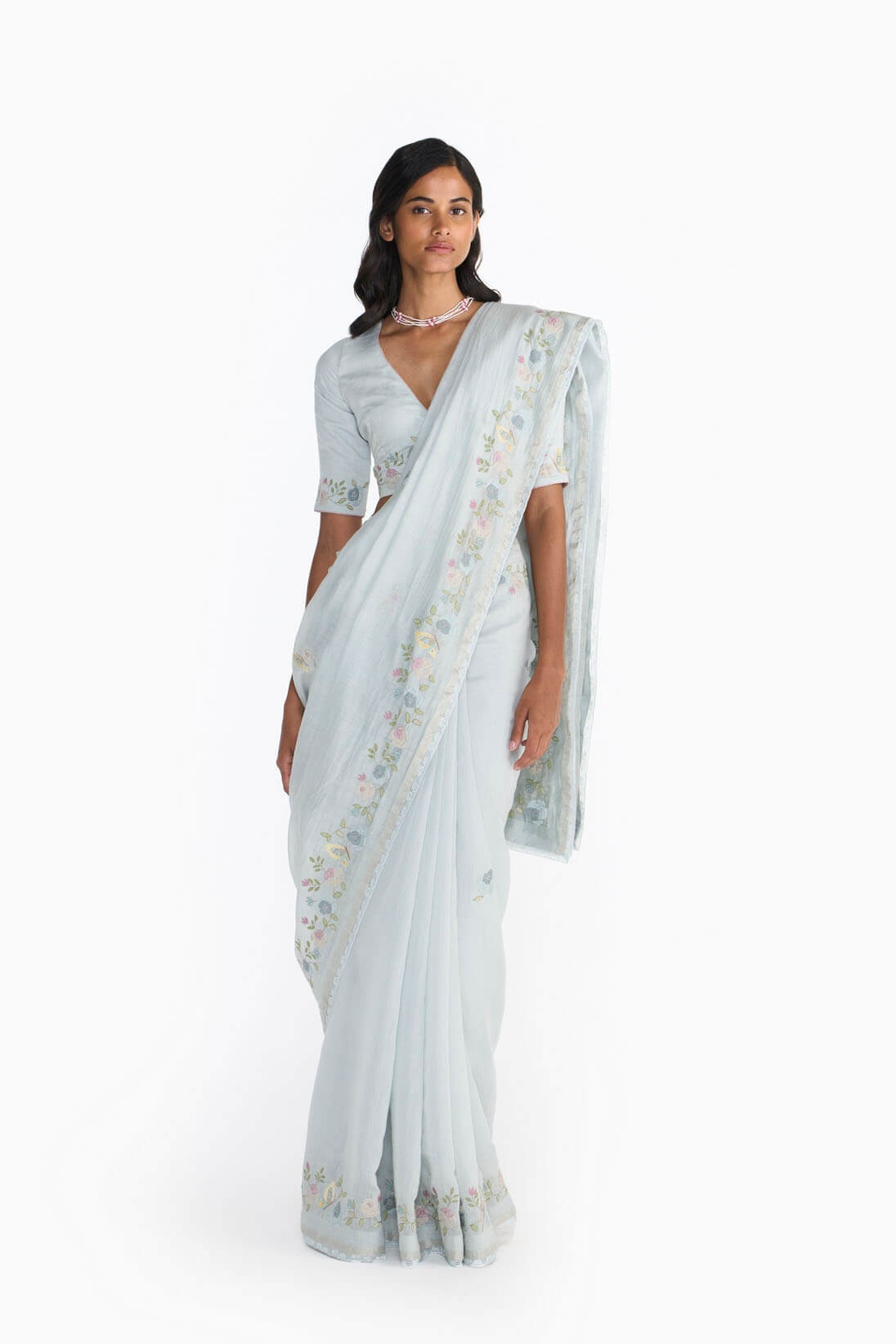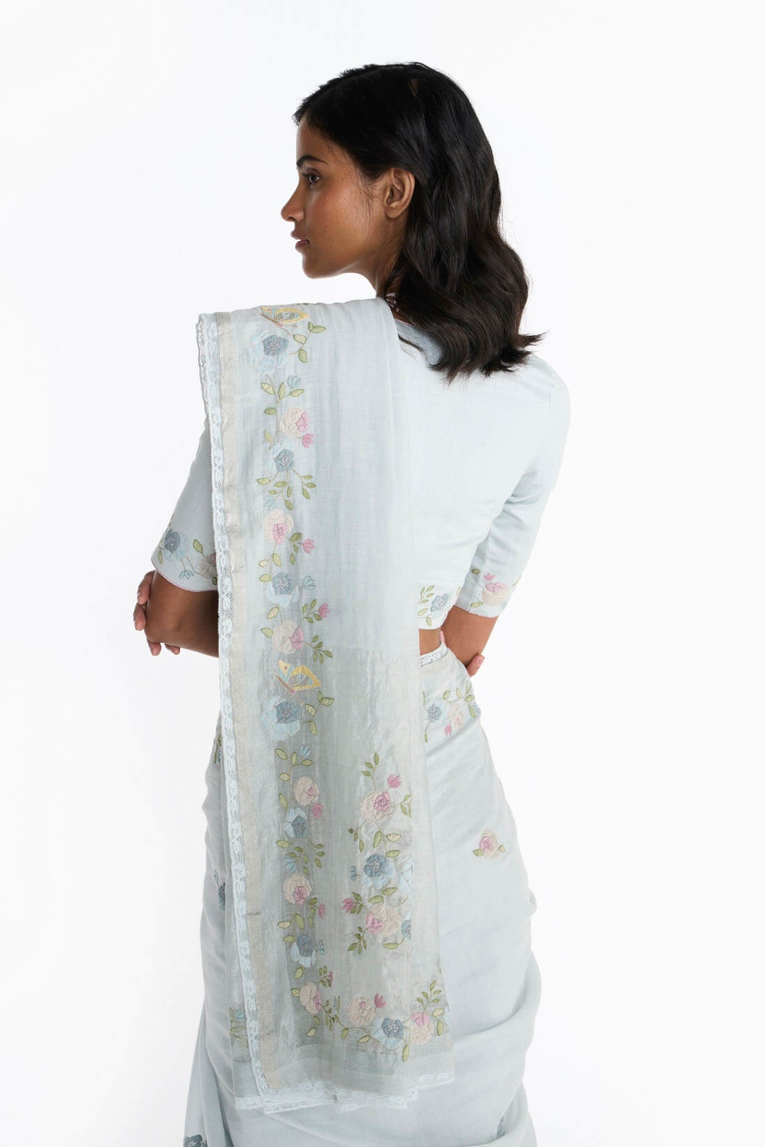 This Pearl Blue Applique Sari features a delicate Rose creeper pattern adorned with charming butterflies. Crafted from the finest khadi silk, it has intricate applique work and soothing blue hue high-lighted with soft pinks and mellow yellows.