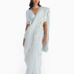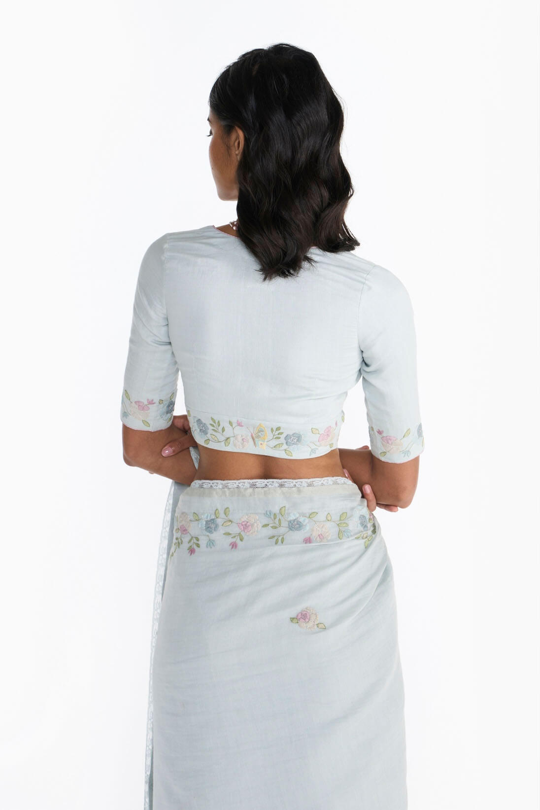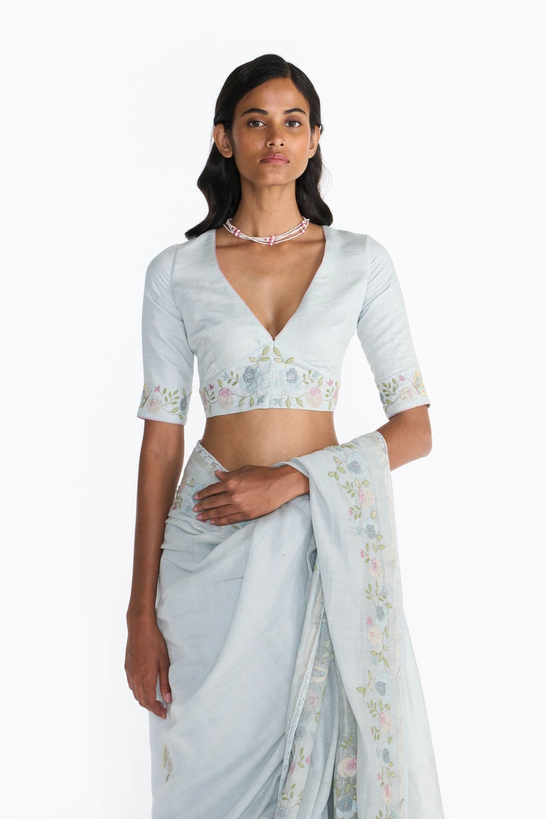 This Pearl Blue Blouse features a sharp V neckline and elbow length sleeves on a fitted bodice. The belt and sleeves of the blouse are decorated with a delicate Rose creeper pattern adorned with charming butterflies.