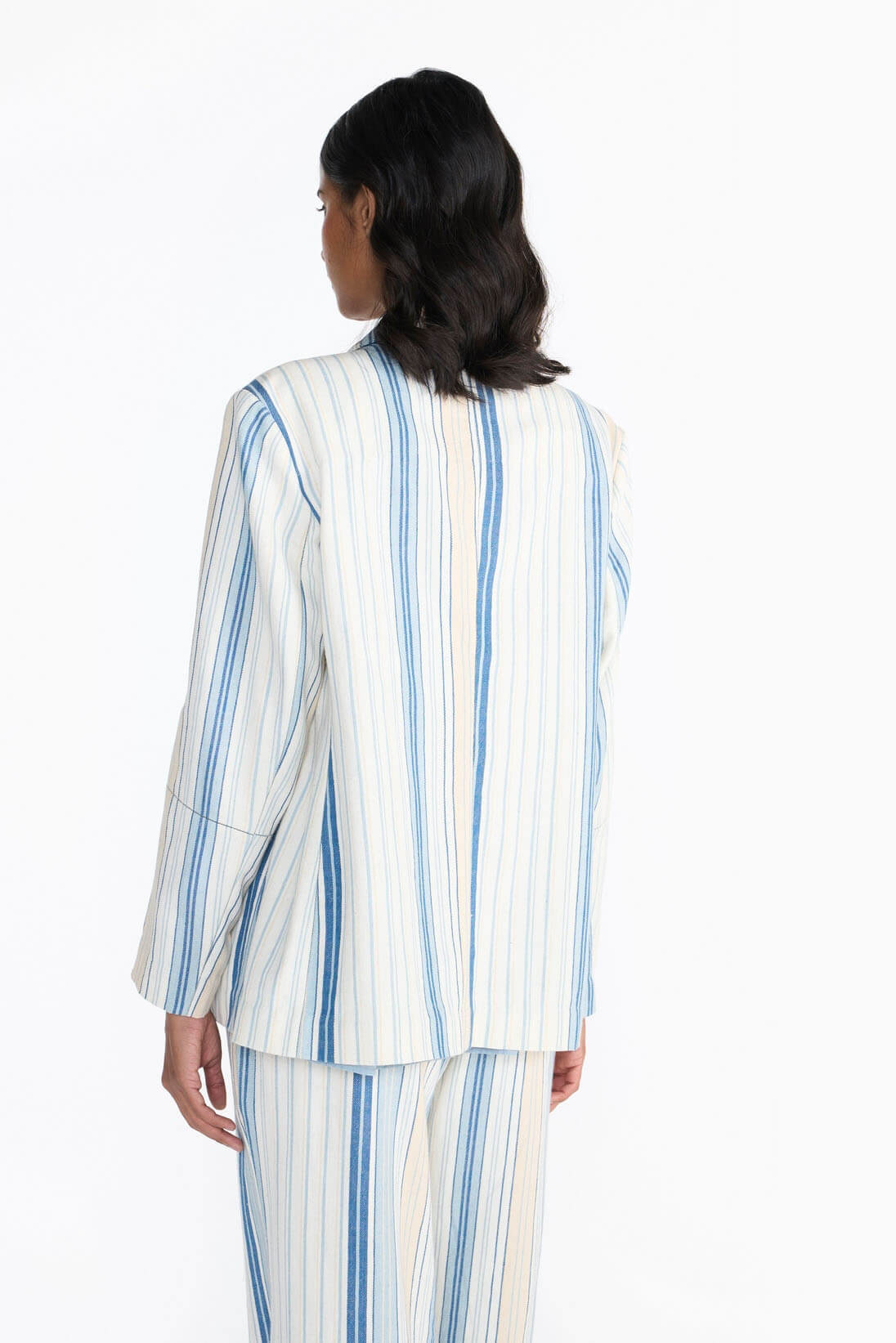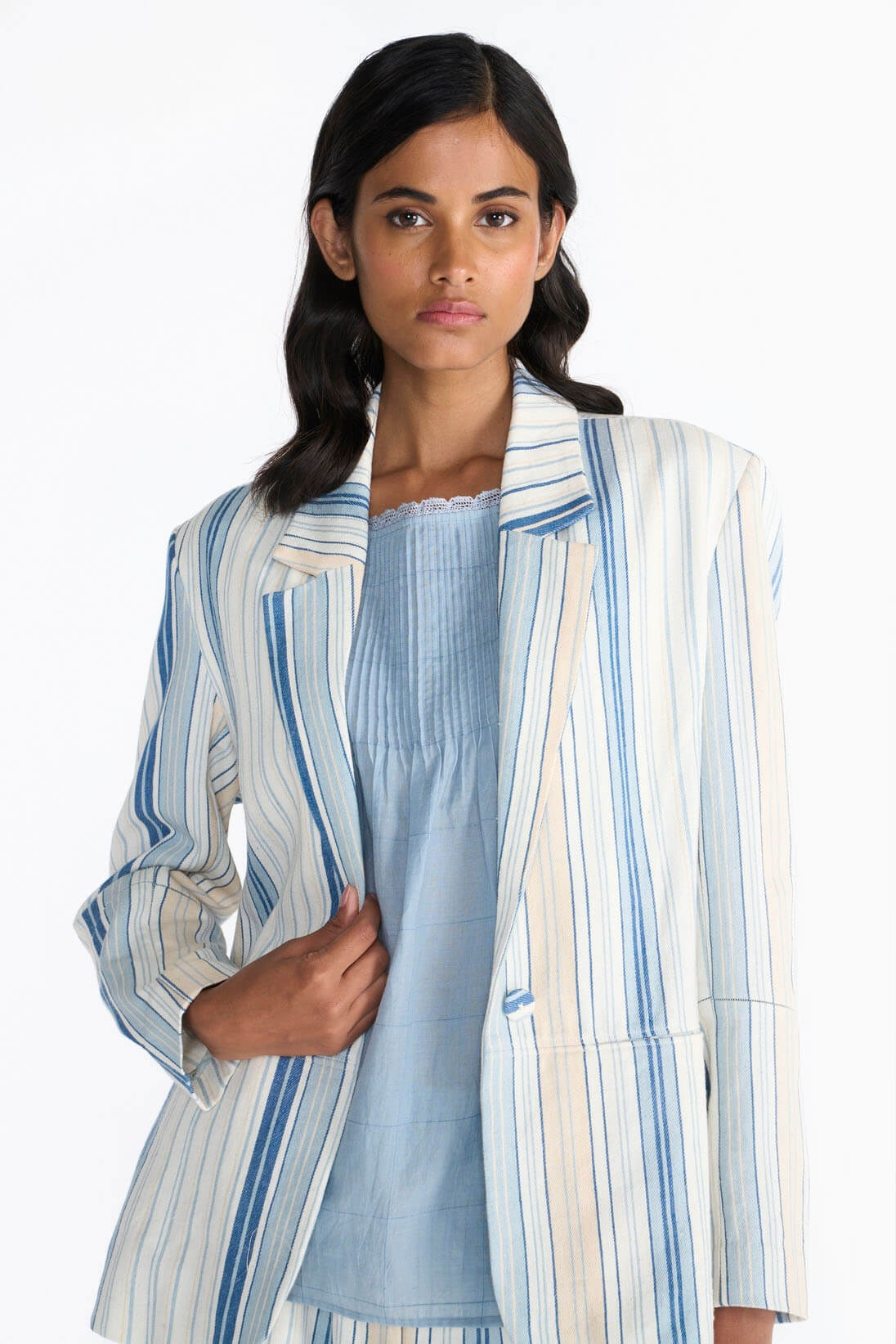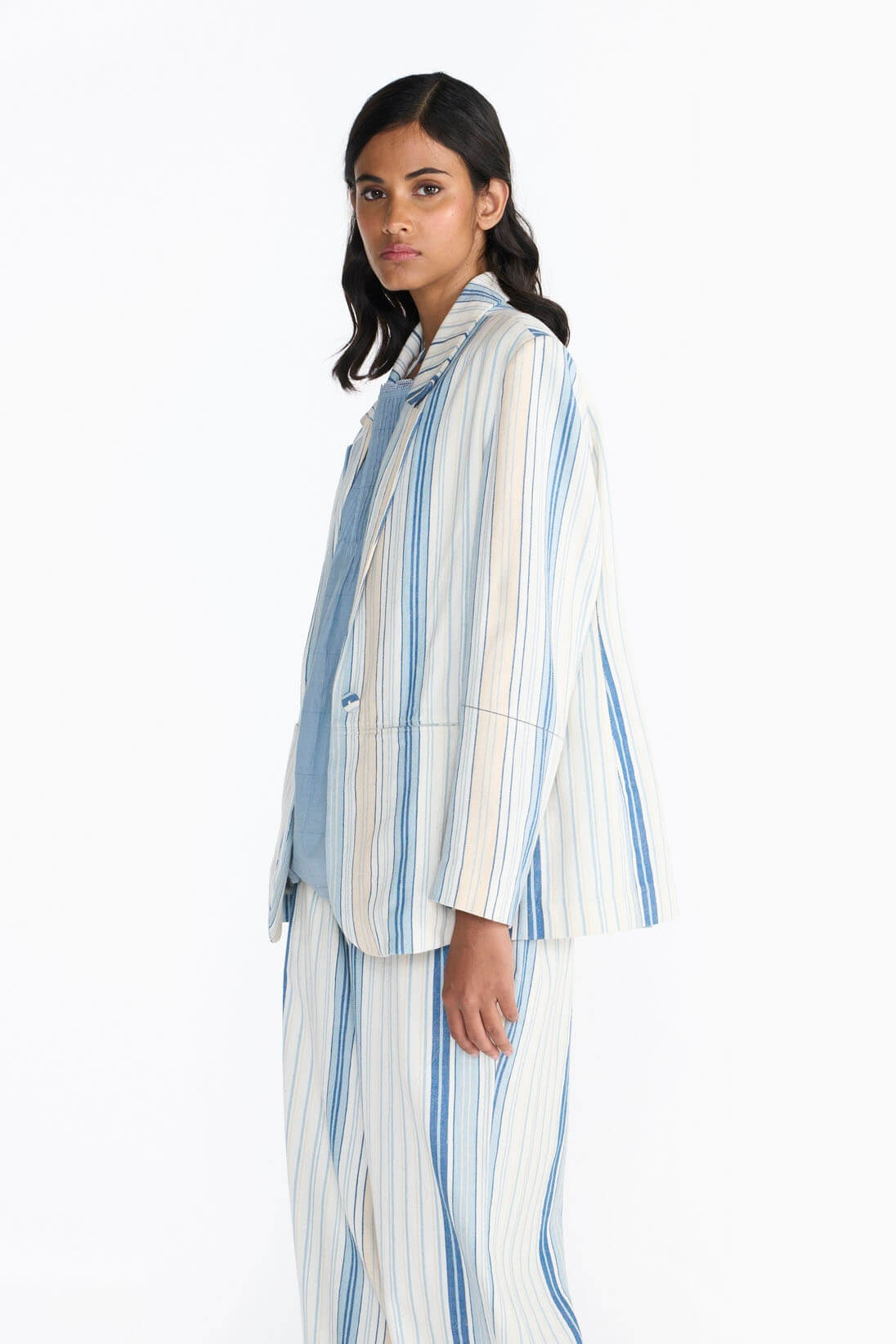 Khadi denim jacket features a fine woven textile with a monochrome striped pattern and is finished with delicate laces. This silhouette has an easy fit with pockets making it a summer wardrobe essential.