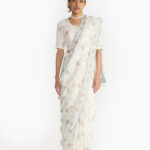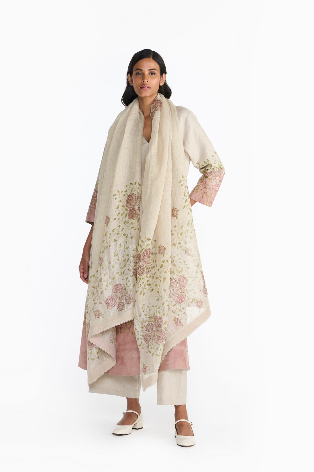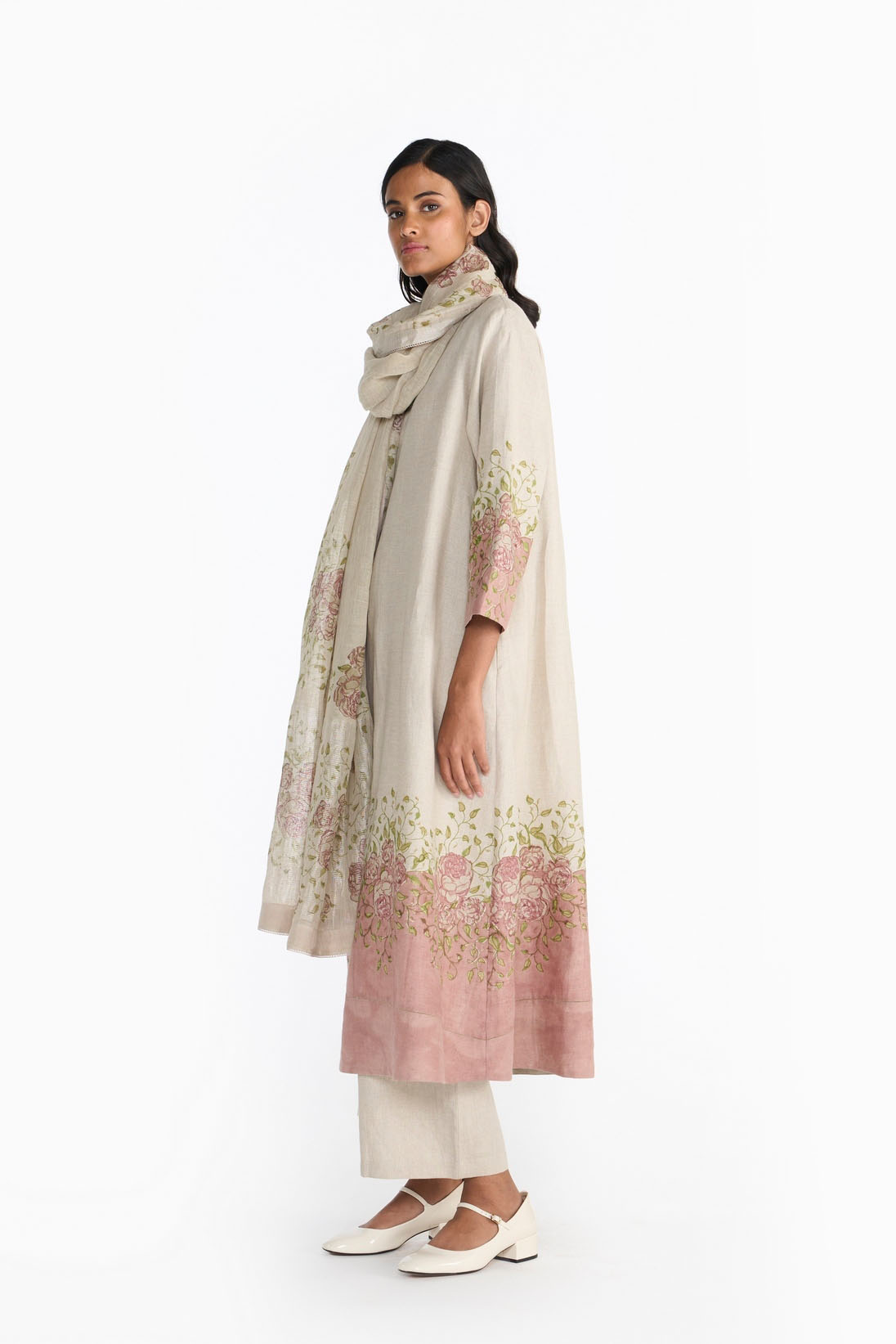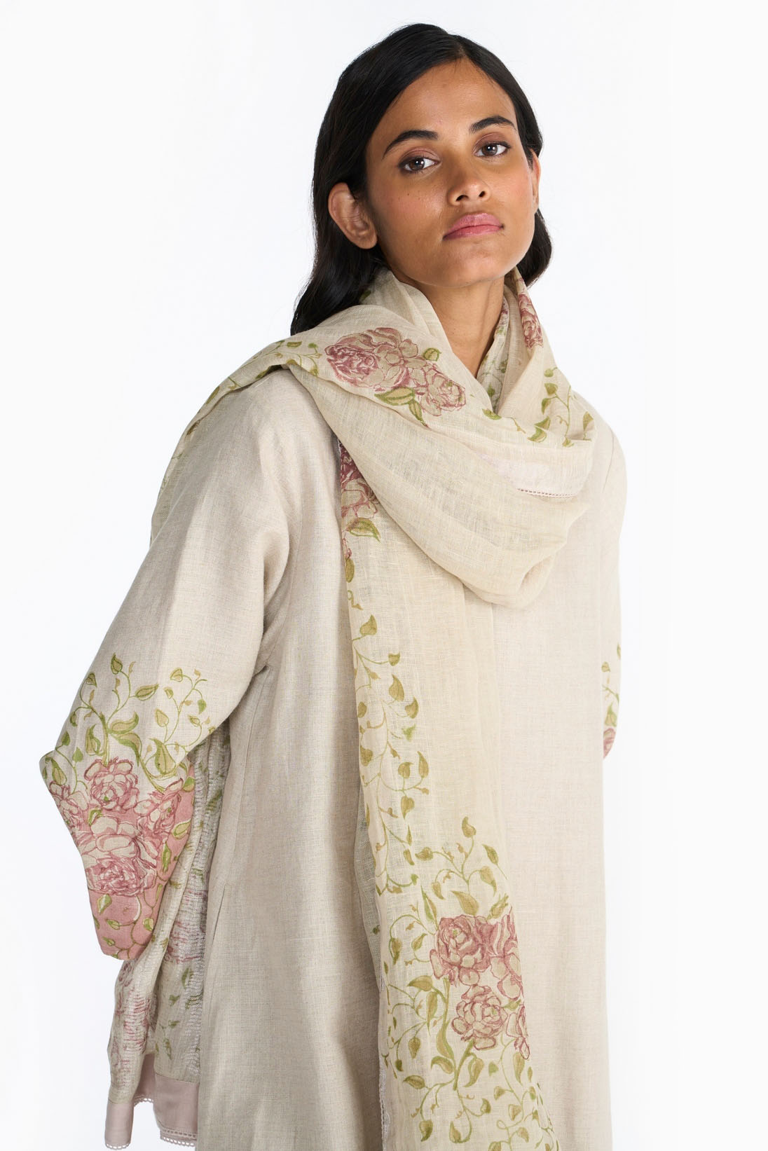 The pattern is hand block printed on handwoven linen dupatta and is finished with delicate laces.”
