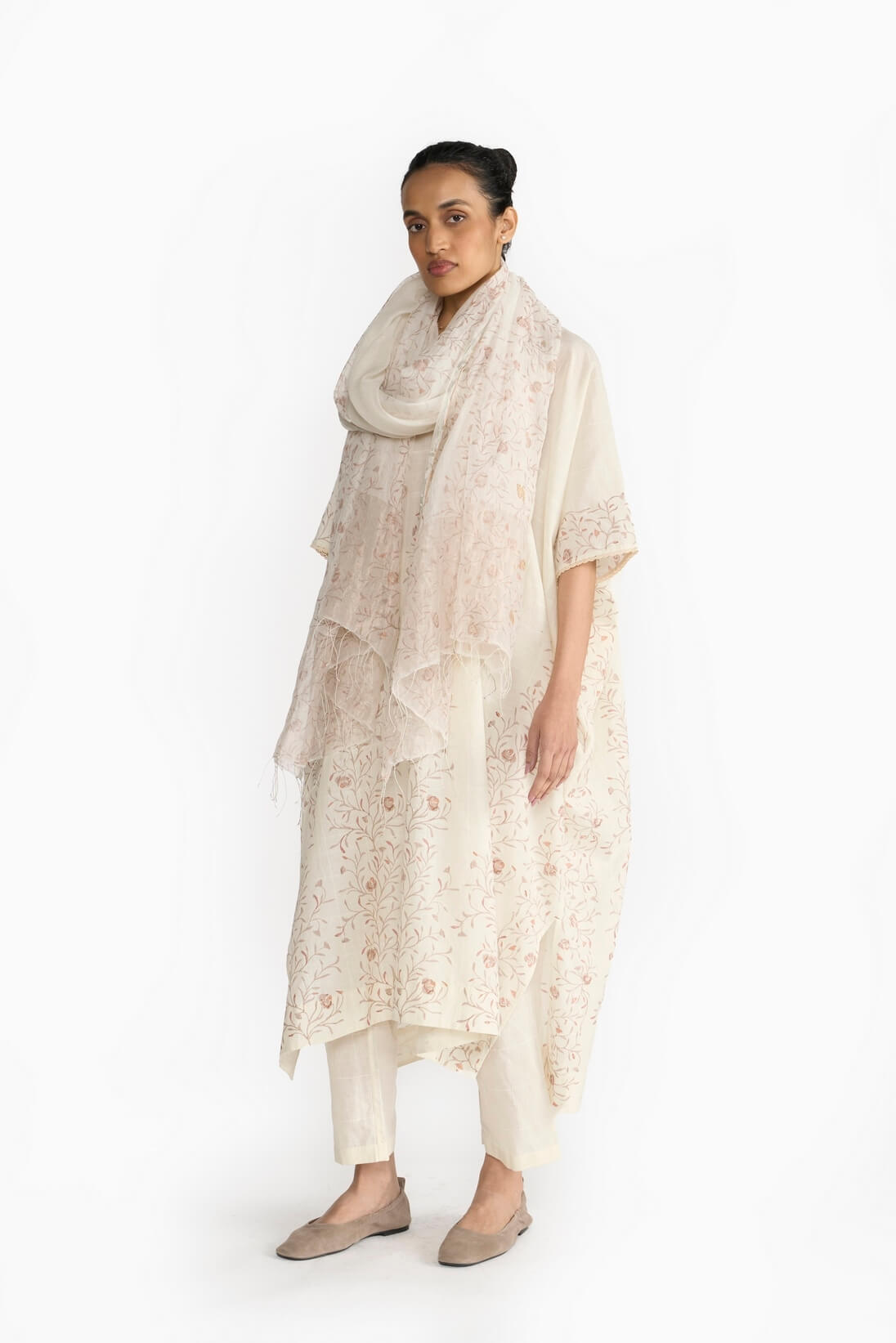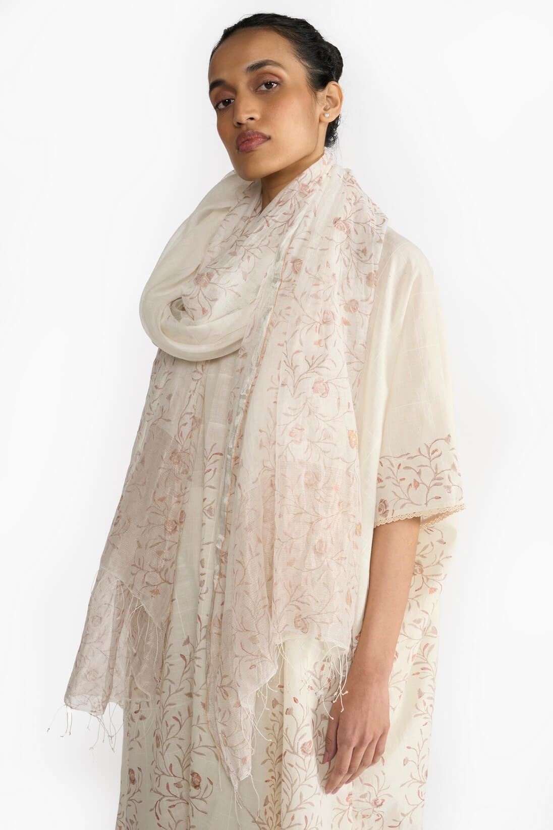 The pattern is hand block printed on fine khadi silk dupatta and is finished with delicate laces ”